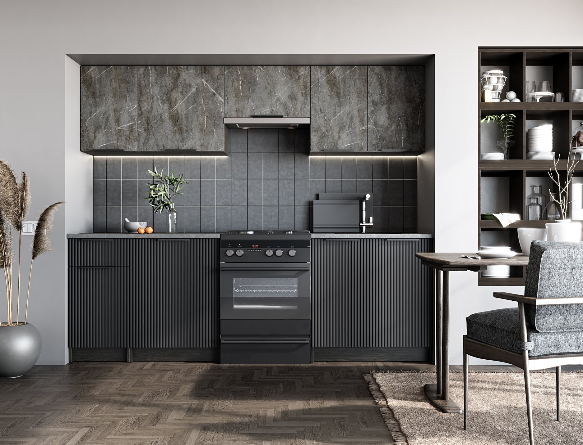 длина комплекта: 240 см, нижние фасады шкафа МДФ, газлифты, столешница толстая. 28 мм, цвет: фасад – серый мрамор/черный, корпус – карбон, столешница – серый