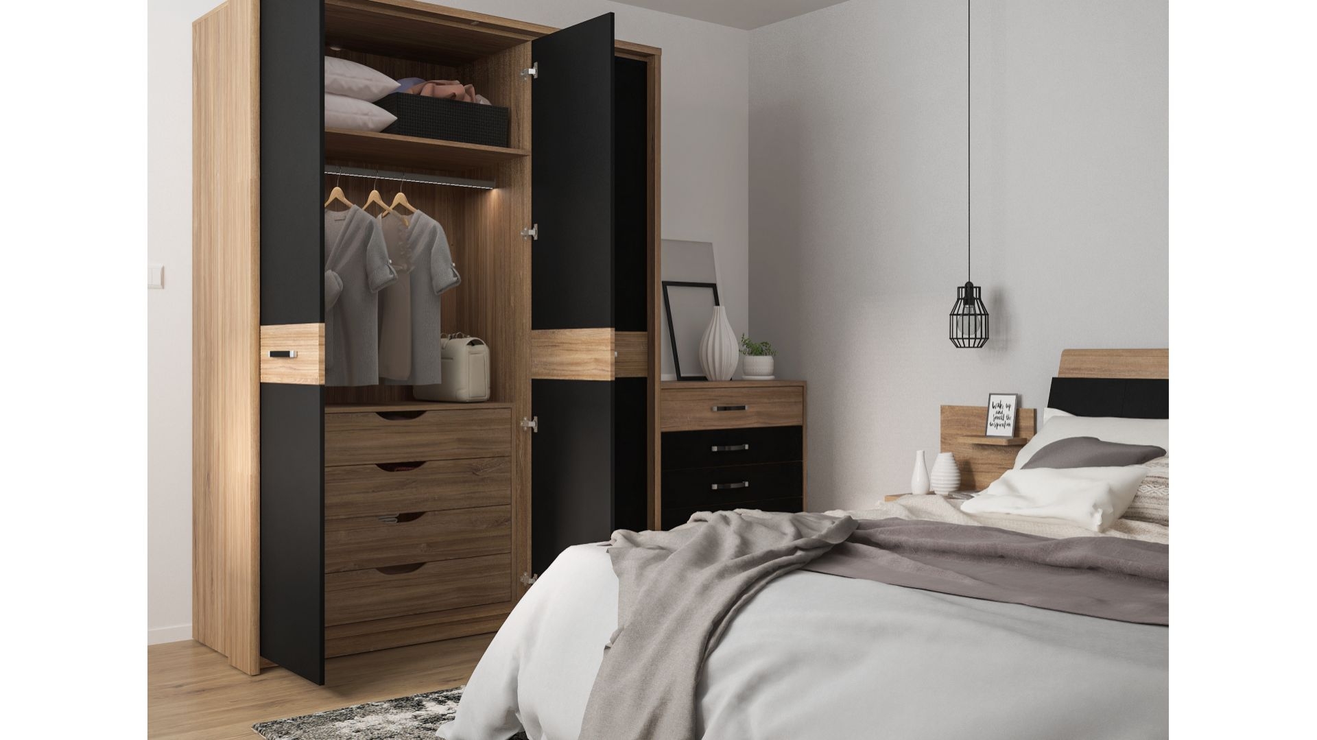 - Отделка: дуб стирлинг/черный матовый.