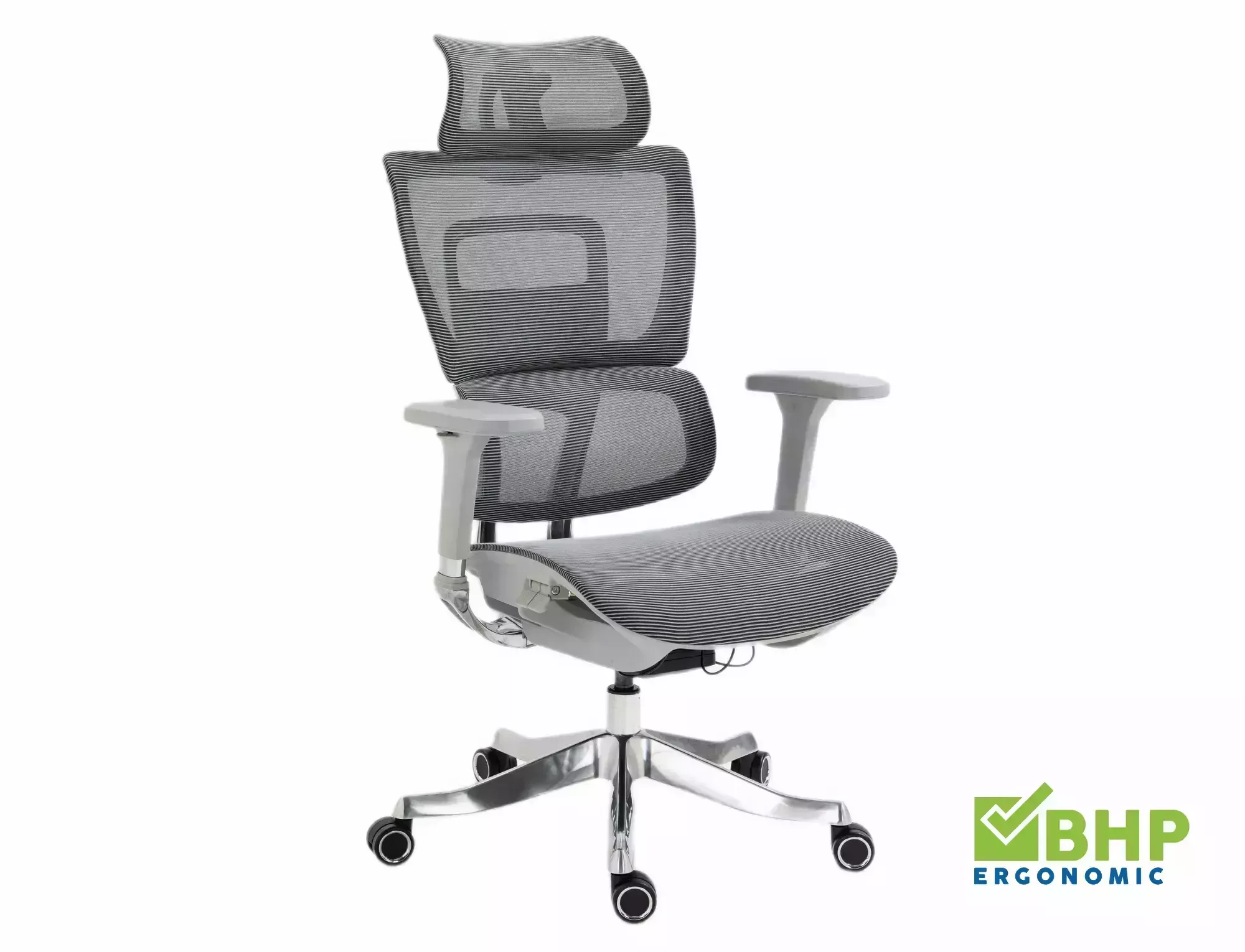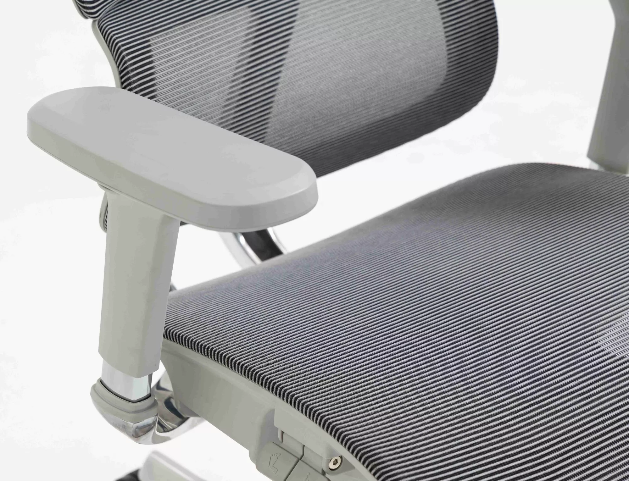 Кресло вращающееся, сетка, серое, мультиблок — проводное управление, синхронный механизм, активируемый весом тела, регулируется: подлокотники 4D, подголовник, поясничный отдел, глубина сиденья. Нейлоновые ролики, алюминиевая крестовина/основание, макс. нагрузка 136 кг, привод класса 4.