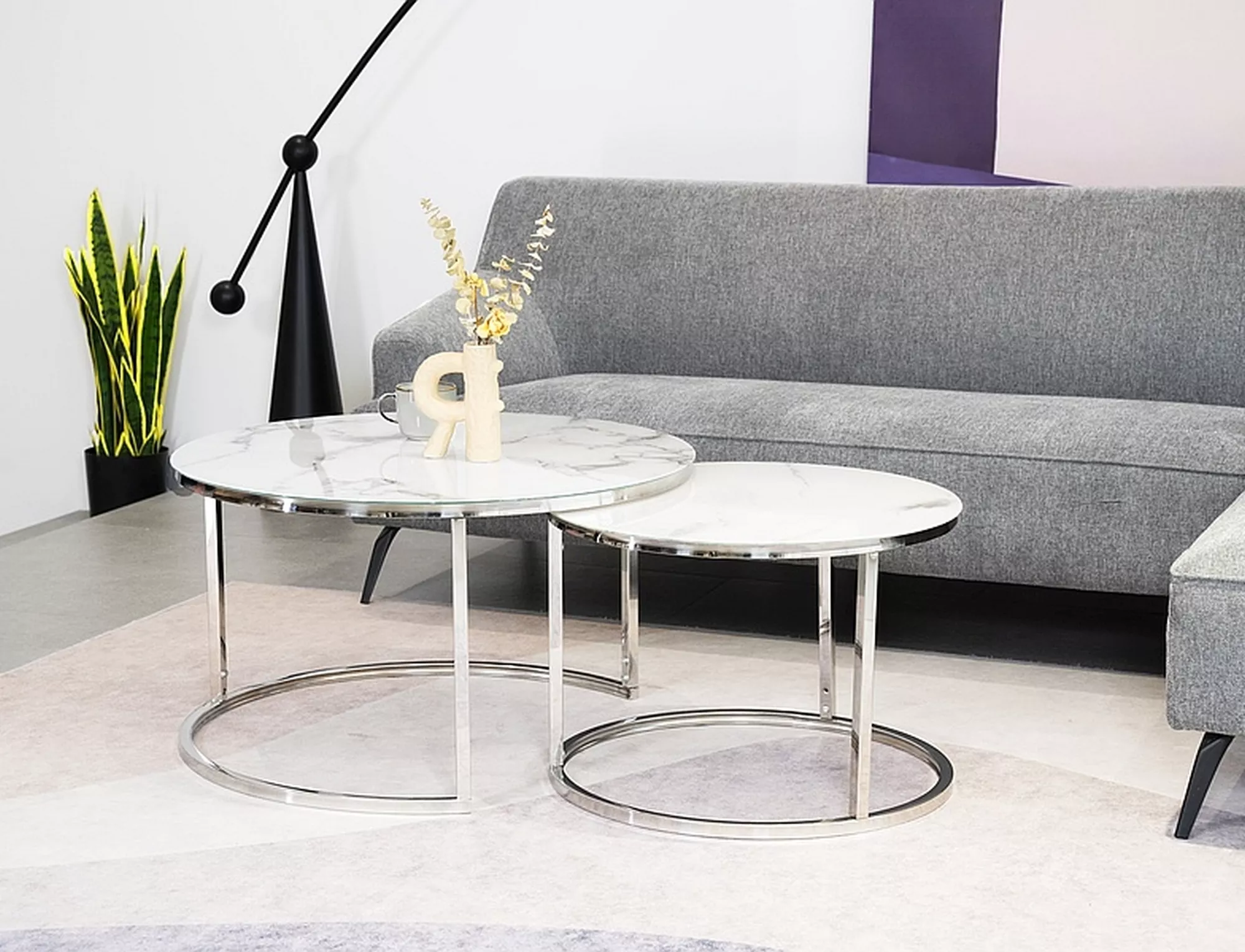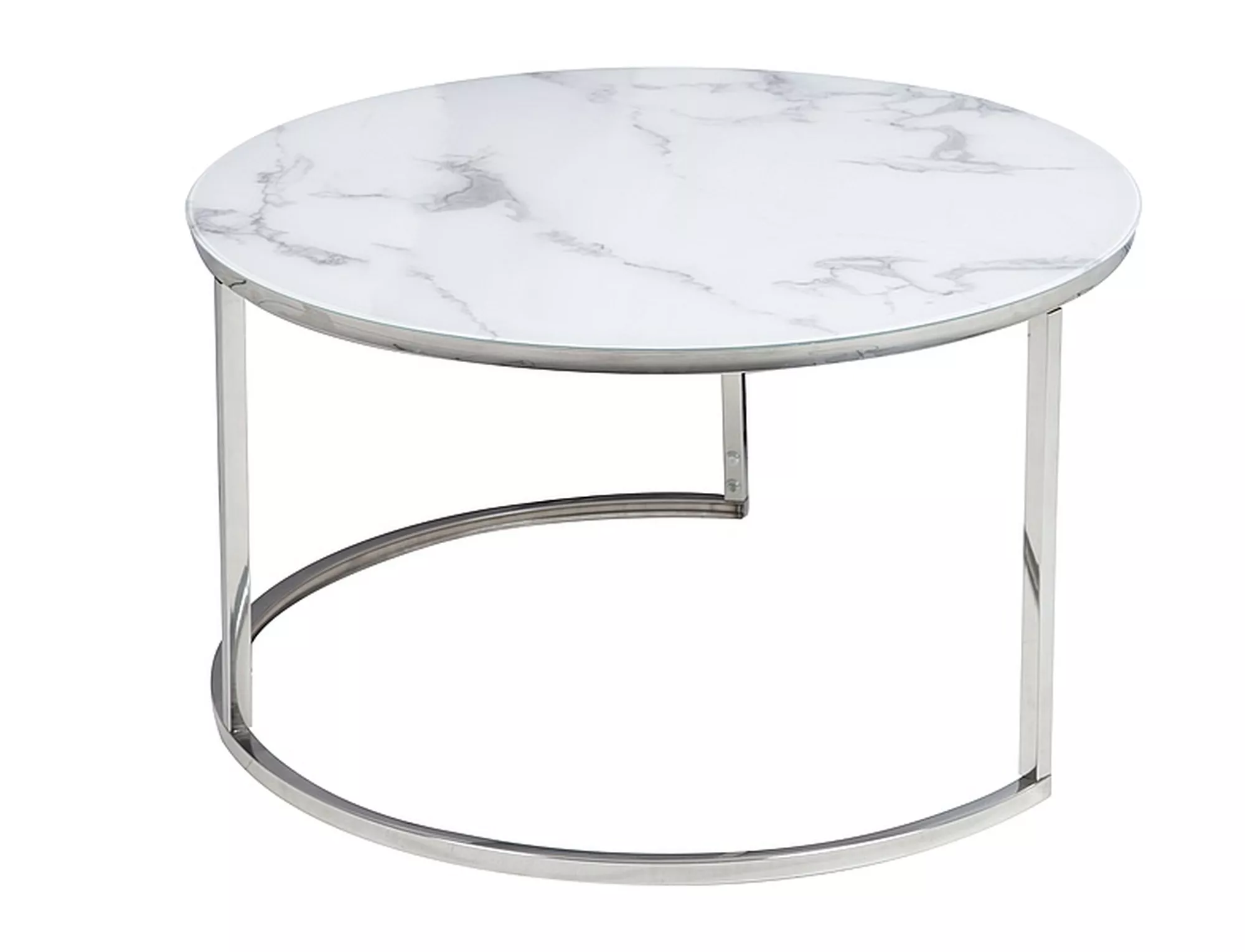 Комплект журнальных столиков, столешница: стекло, каркас: металл, цвет: белый, под мрамор/хром. Размеры меньшего стола: 60 см, высота 42 см.