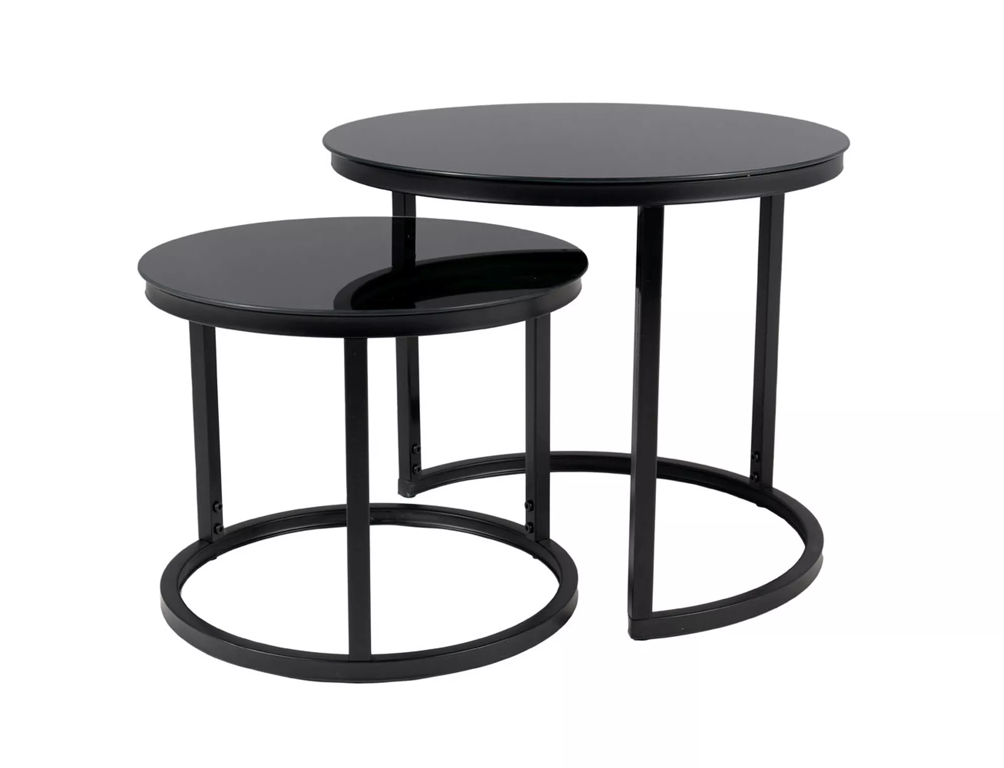 Комплект столов, столешница: стекло, каркас: металл, цвет: чёрный/черный матовый. Размеры меньшего стола: фи: 43, высота — 35см.