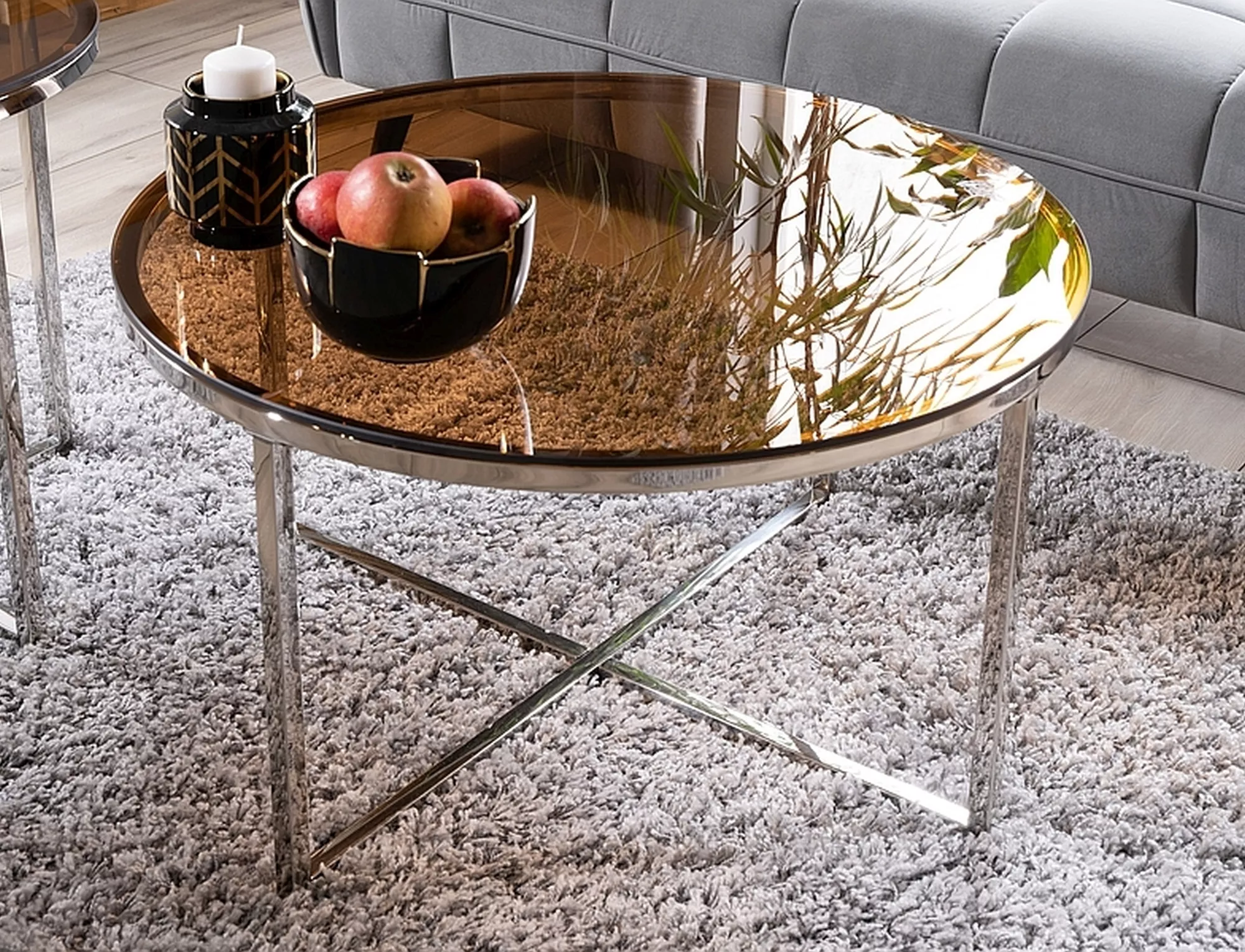 Столик журнальный, столешница: янтарное закаленное стекло, каркас: нержавеющая сталь, цвет: серебро.