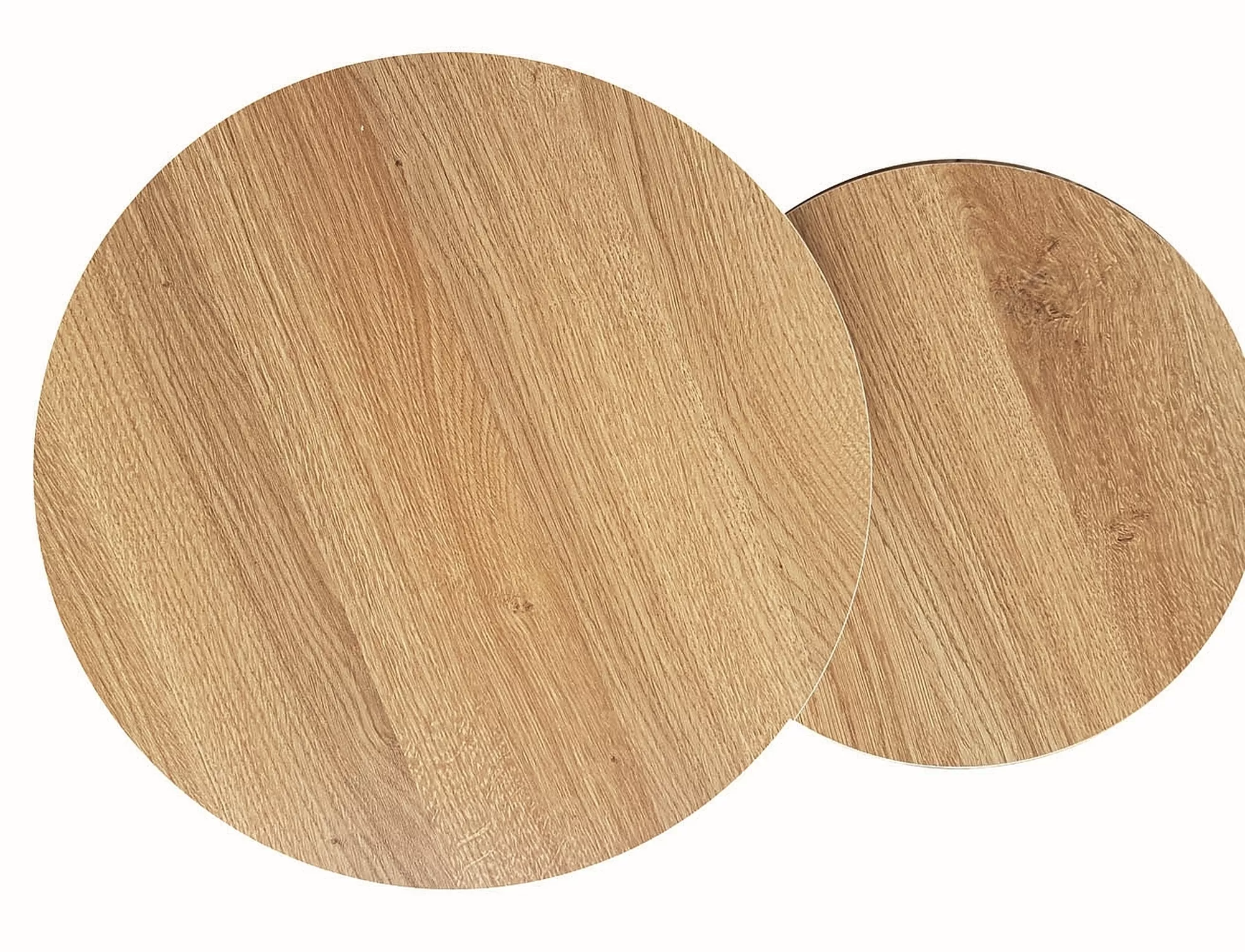 Комплект скамеек, столешница: ламинат, каркас: металл, цвет: дуб/черный матовый. Размеры меньшего стола: диаметр 48; высота: 42см.