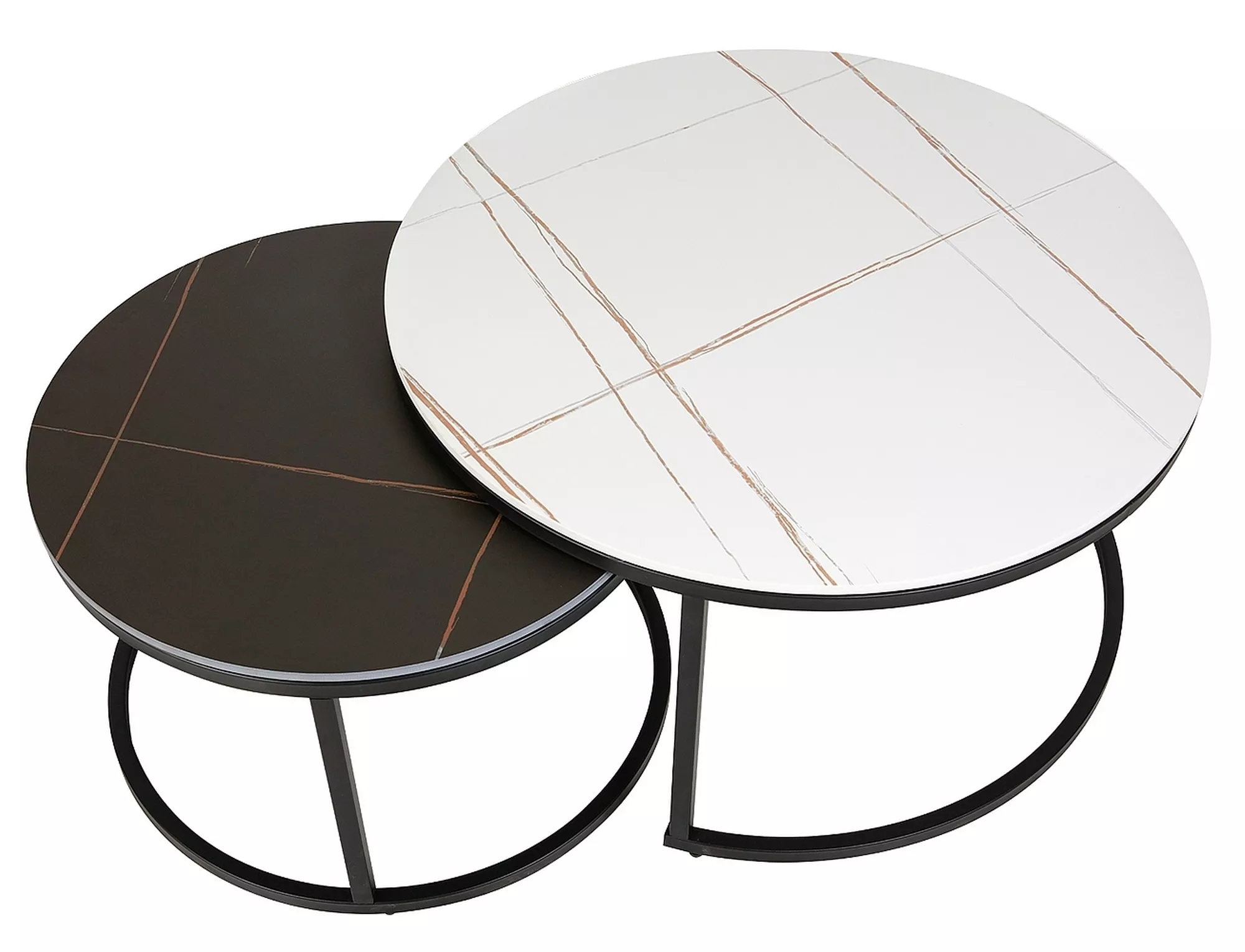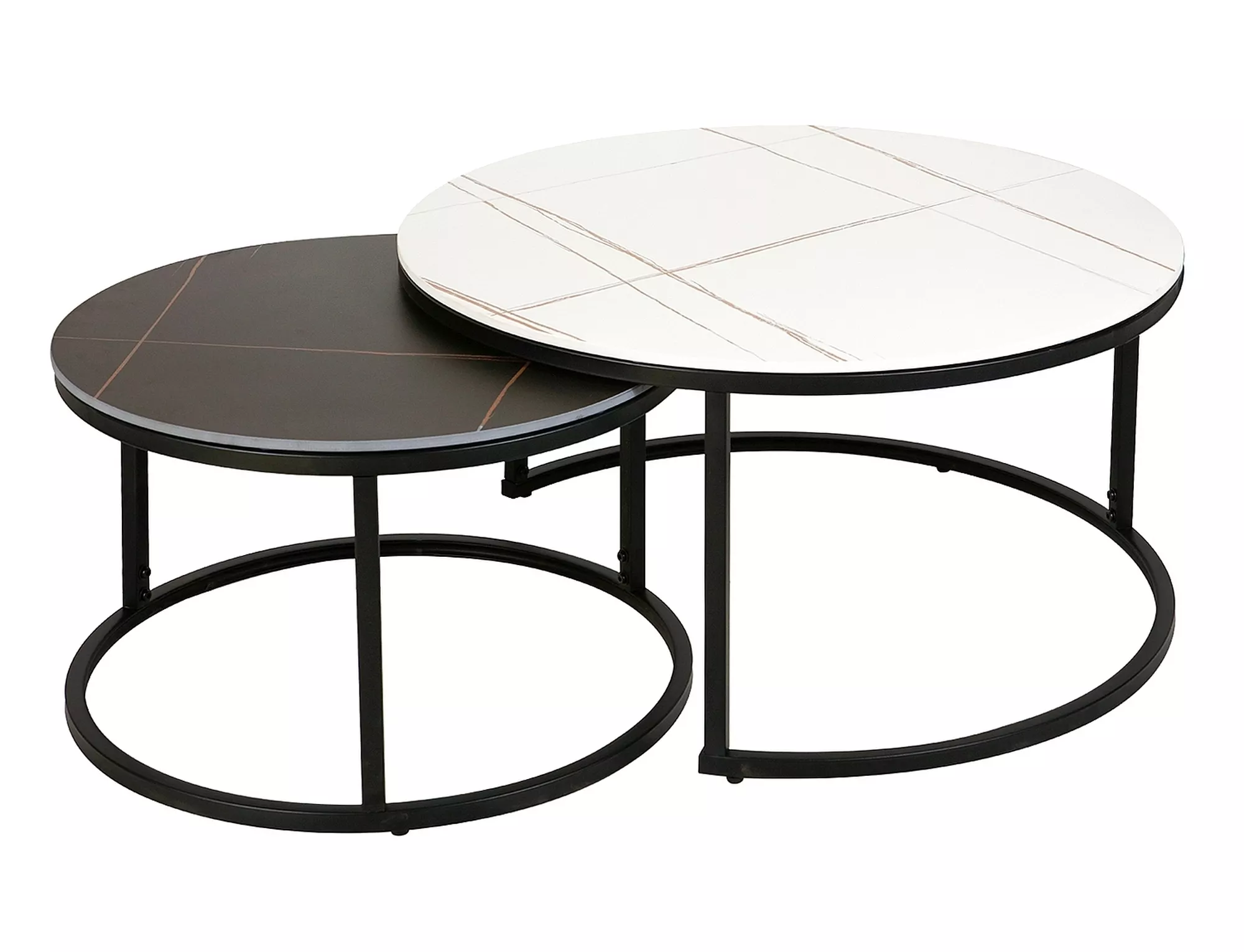 Комплект журнальных столиков, столешница: керамика, каркас: металл, цвет: белый, черный, под мрамор/черный матовый. Размеры меньшего стола: диаметр 60; рост: 38см.