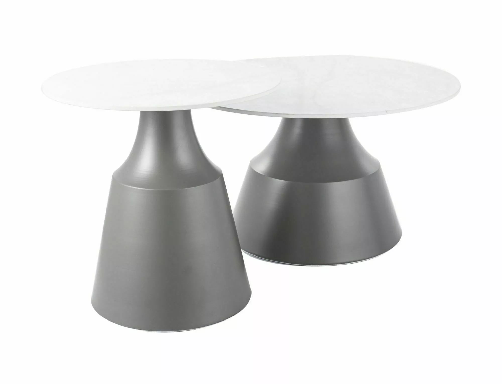 Стол журнальный, столешница: керамика, каркас: металл, цвет: белый/серый матовый. Комплект, размеры второго журнального столика: фи-50, высота-50 см.