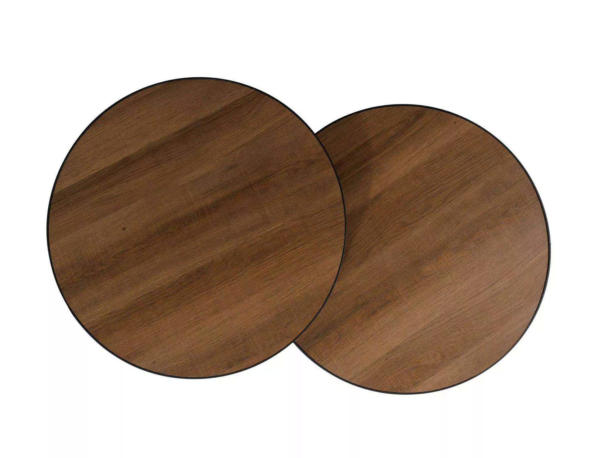 Комплект скамеек, столешница: МДФ+шпон, каркас: металл, цвет: орех/черный. Размеры меньшего стола: диаметр — 50см, высота — 45см.