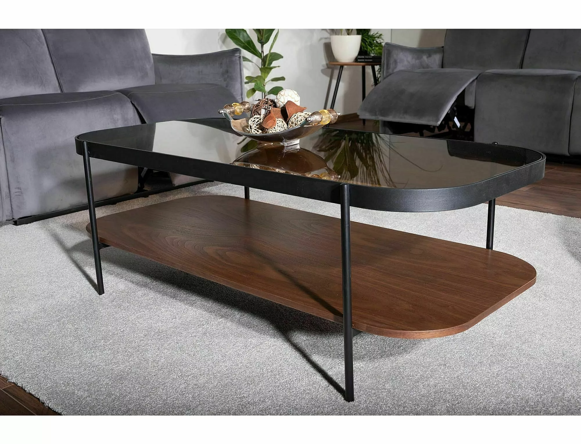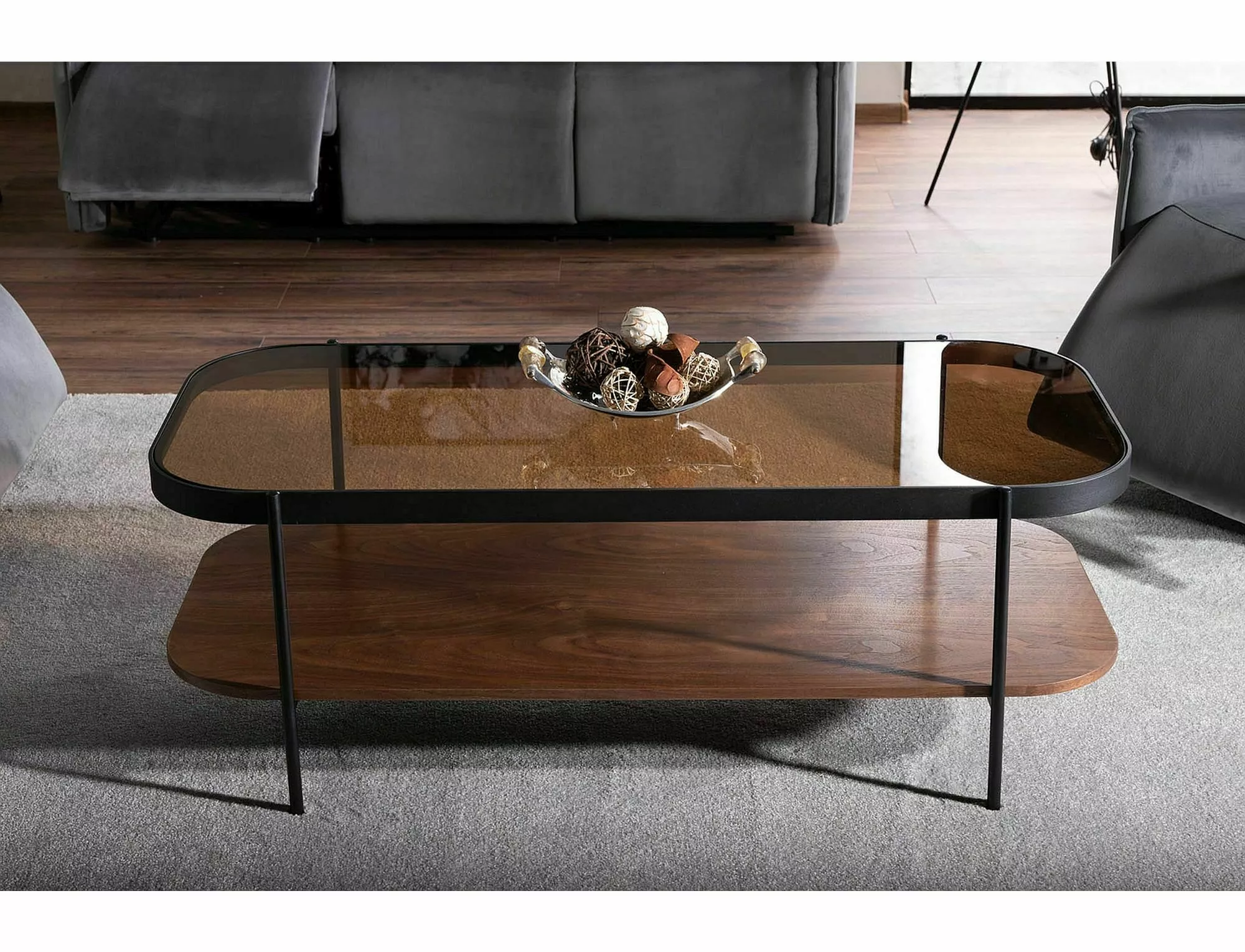 Столик журнальный, столешница: янтарное закаленное стекло + МДФ + натуральный шпон, каркас: металл, цвет: орех/черный матовый.