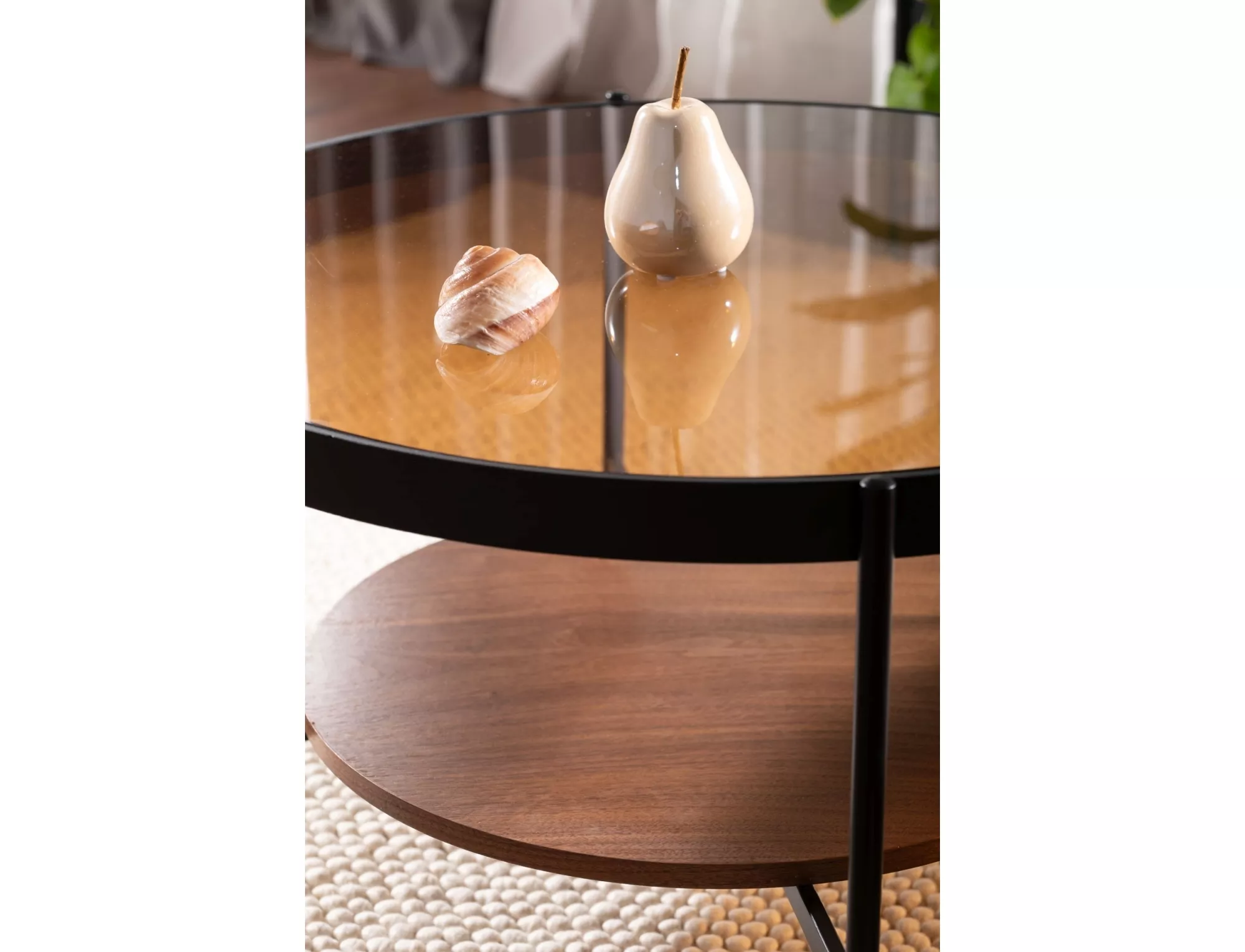 Столик журнальный, столешница: янтарное закаленное стекло + МДФ + натуральный шпон, каркас: металл, цвет: орех/черный матовый.