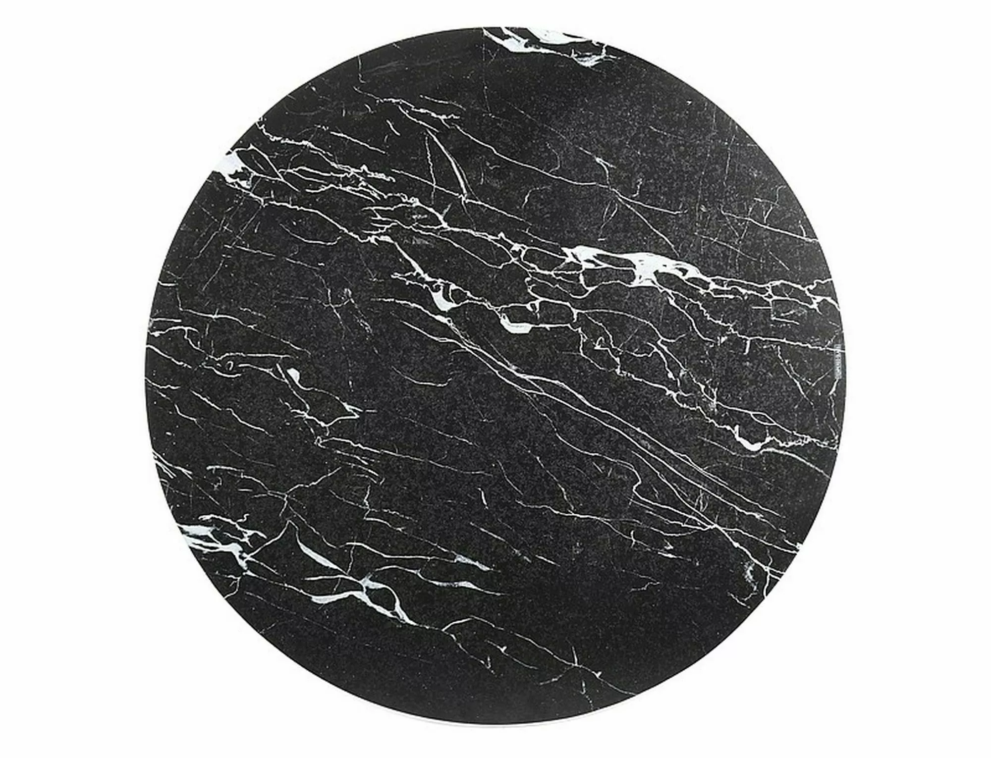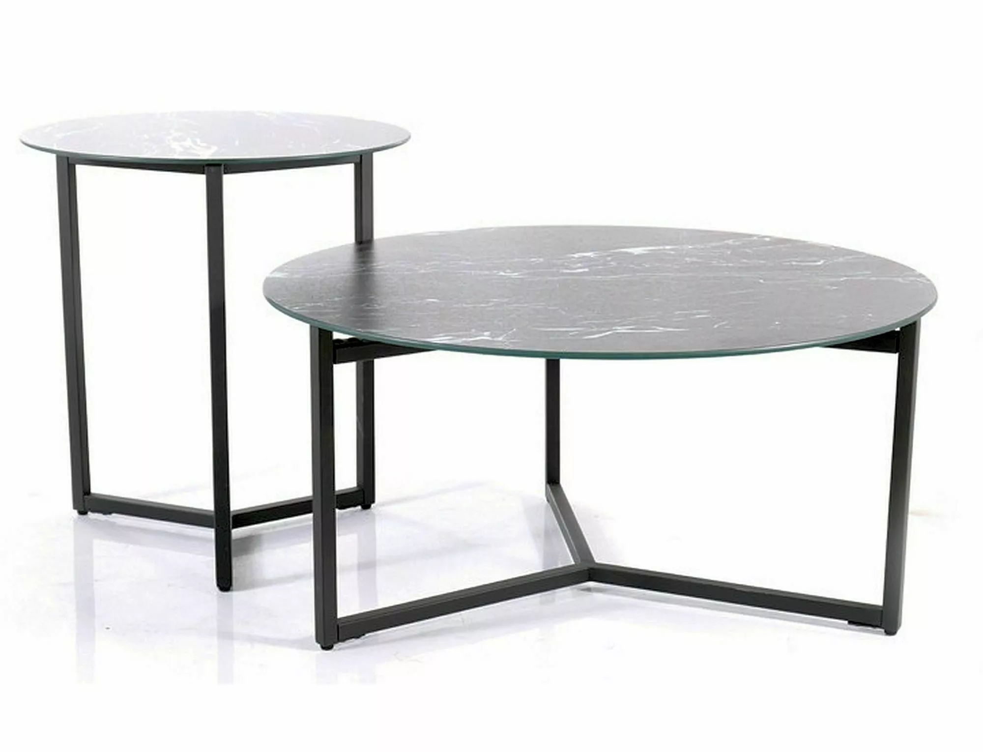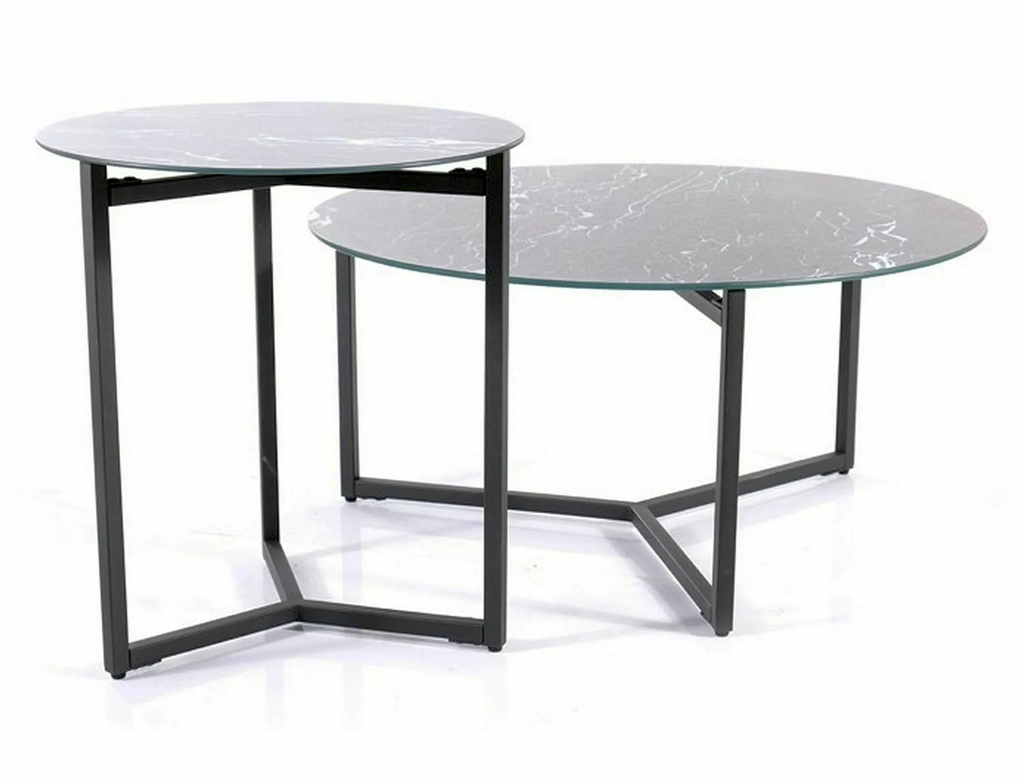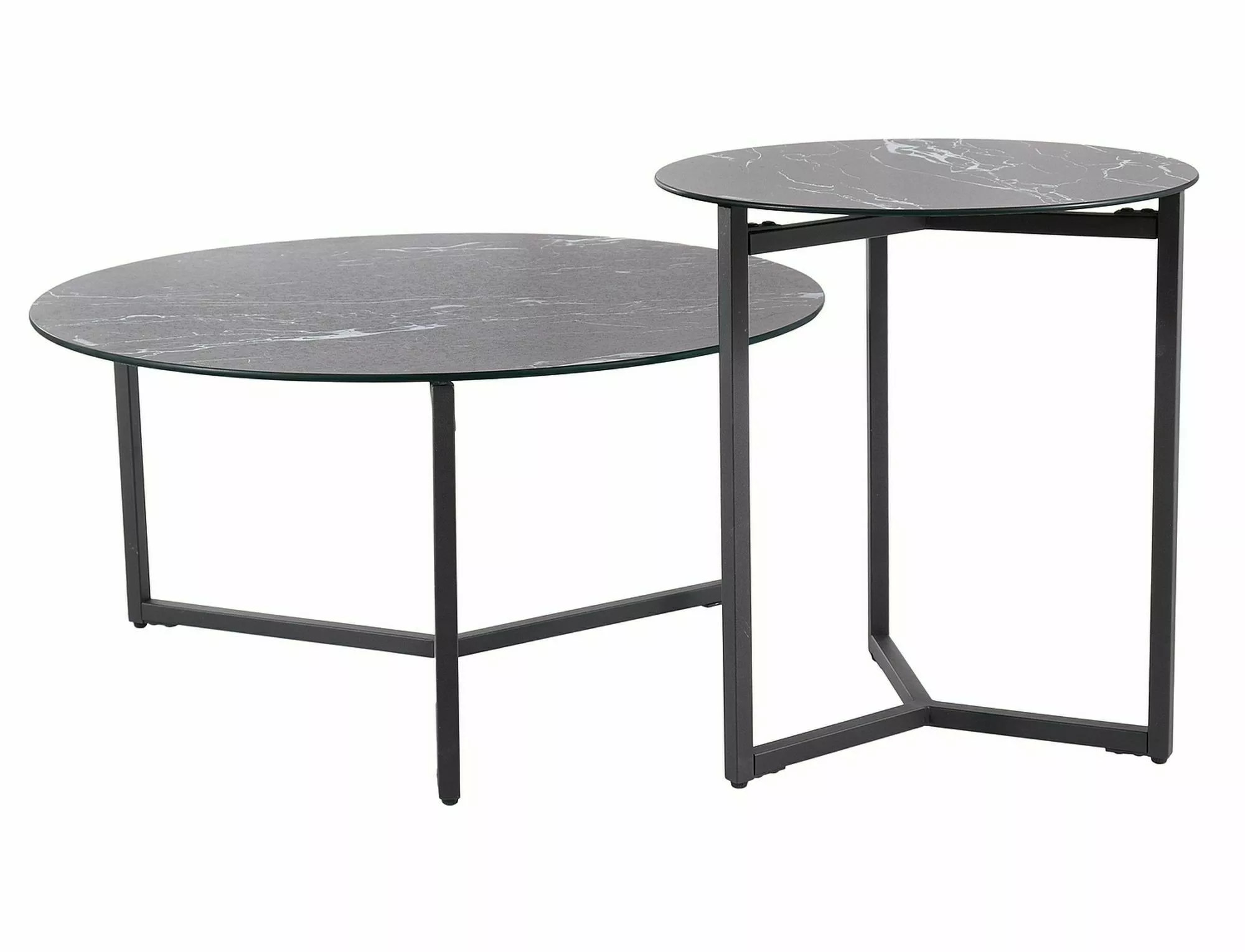 Комплект столов, столешница: закаленное стекло с эффектом мрамора, каркас: металл, цвет: черный/черный. Размеры меньшего стола: фи: 50, высота — 55см.