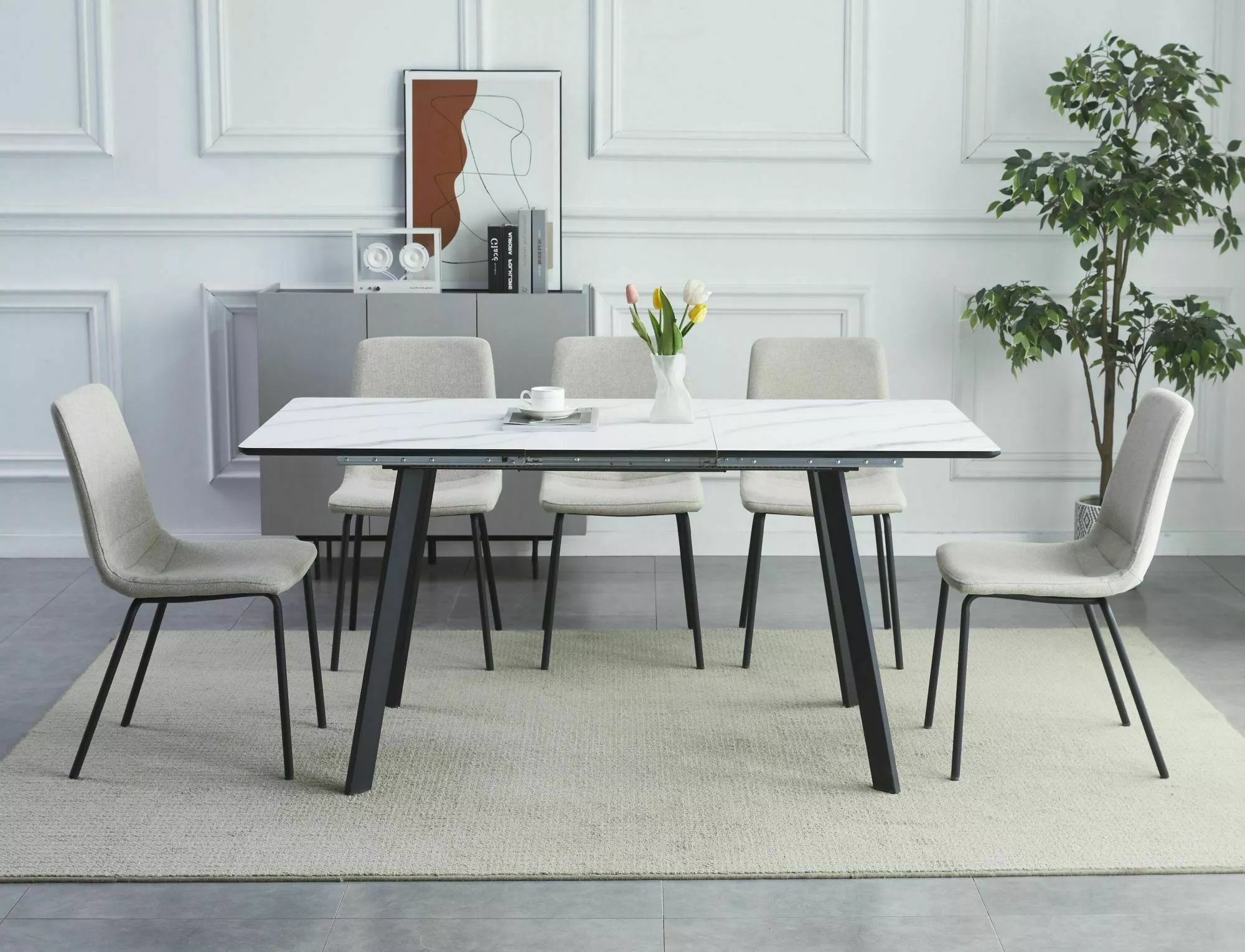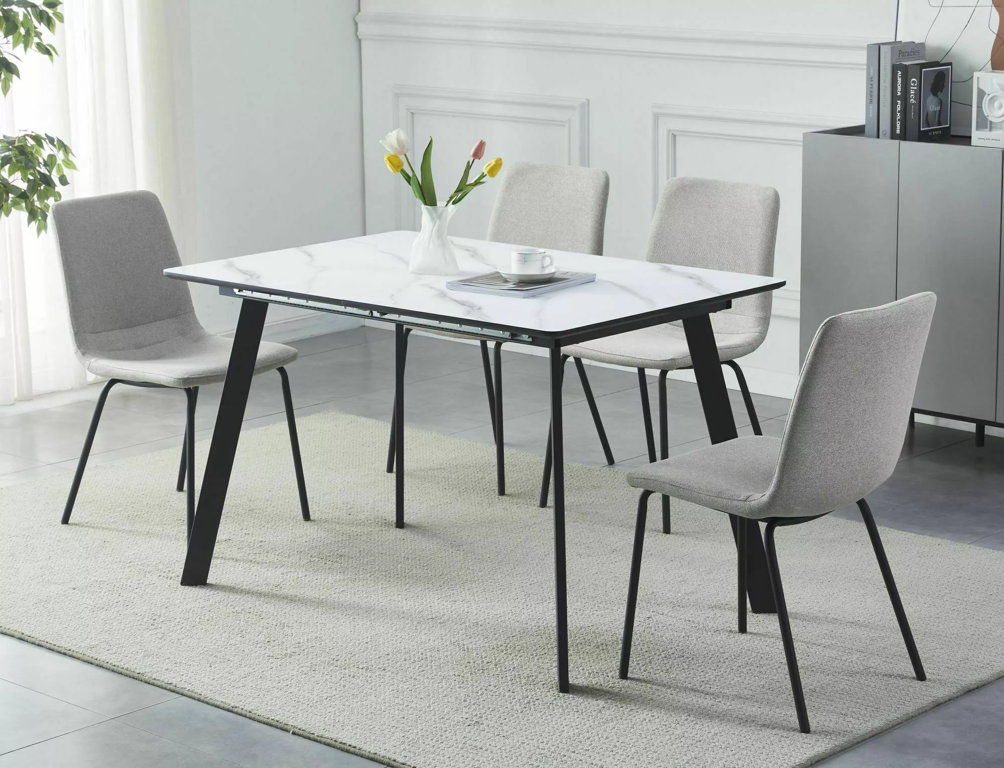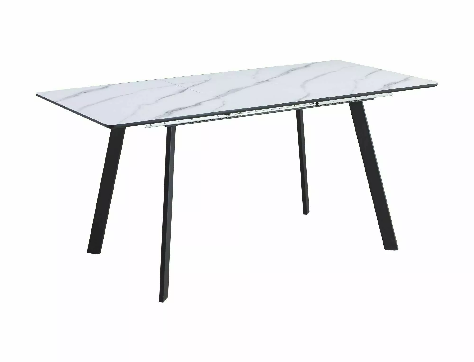 Стол раздвижной, столешница: плита МДФ + шпон, каркас: металл, цвет: белый под мрамор/черный.