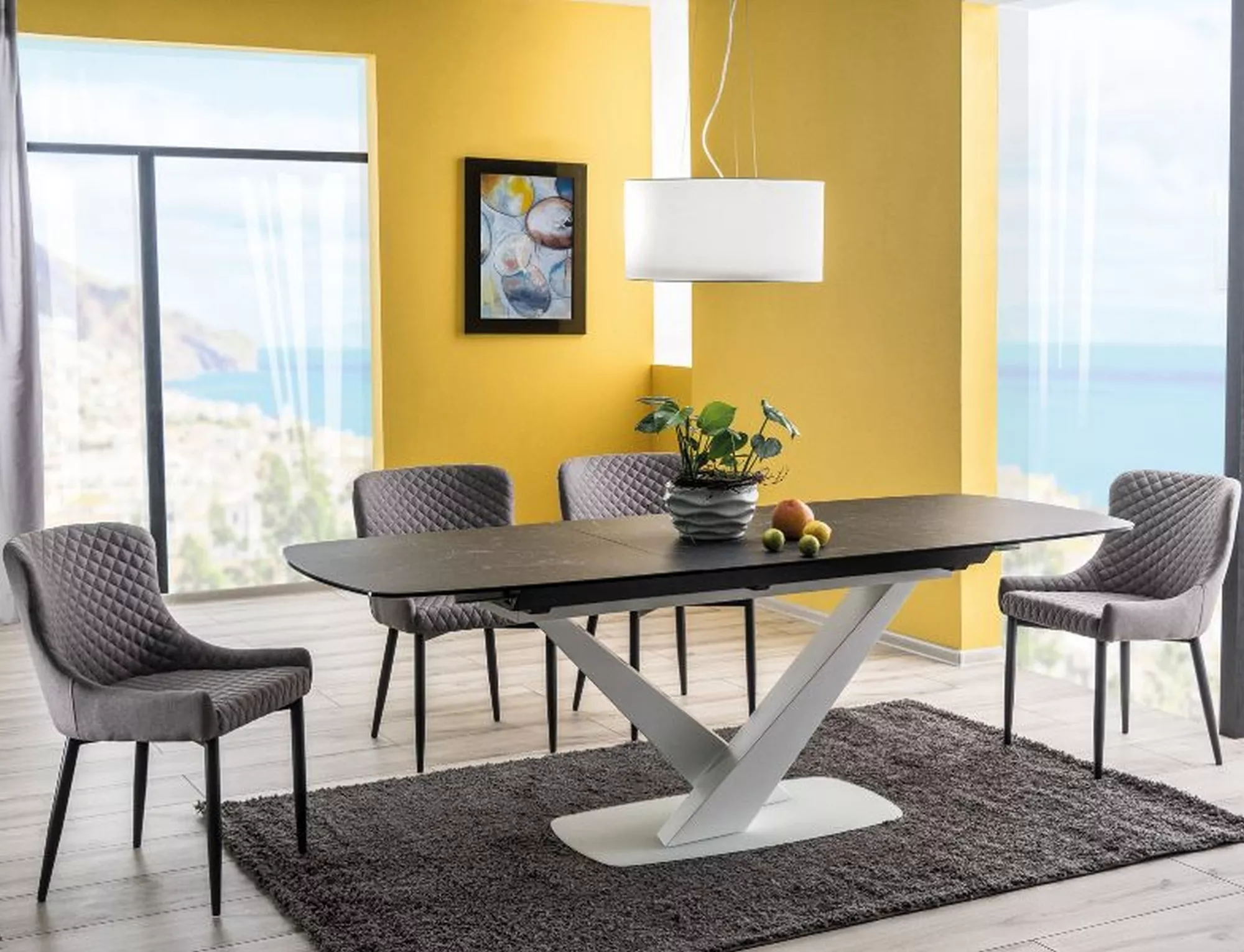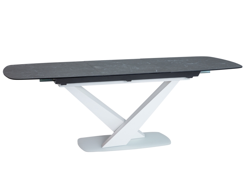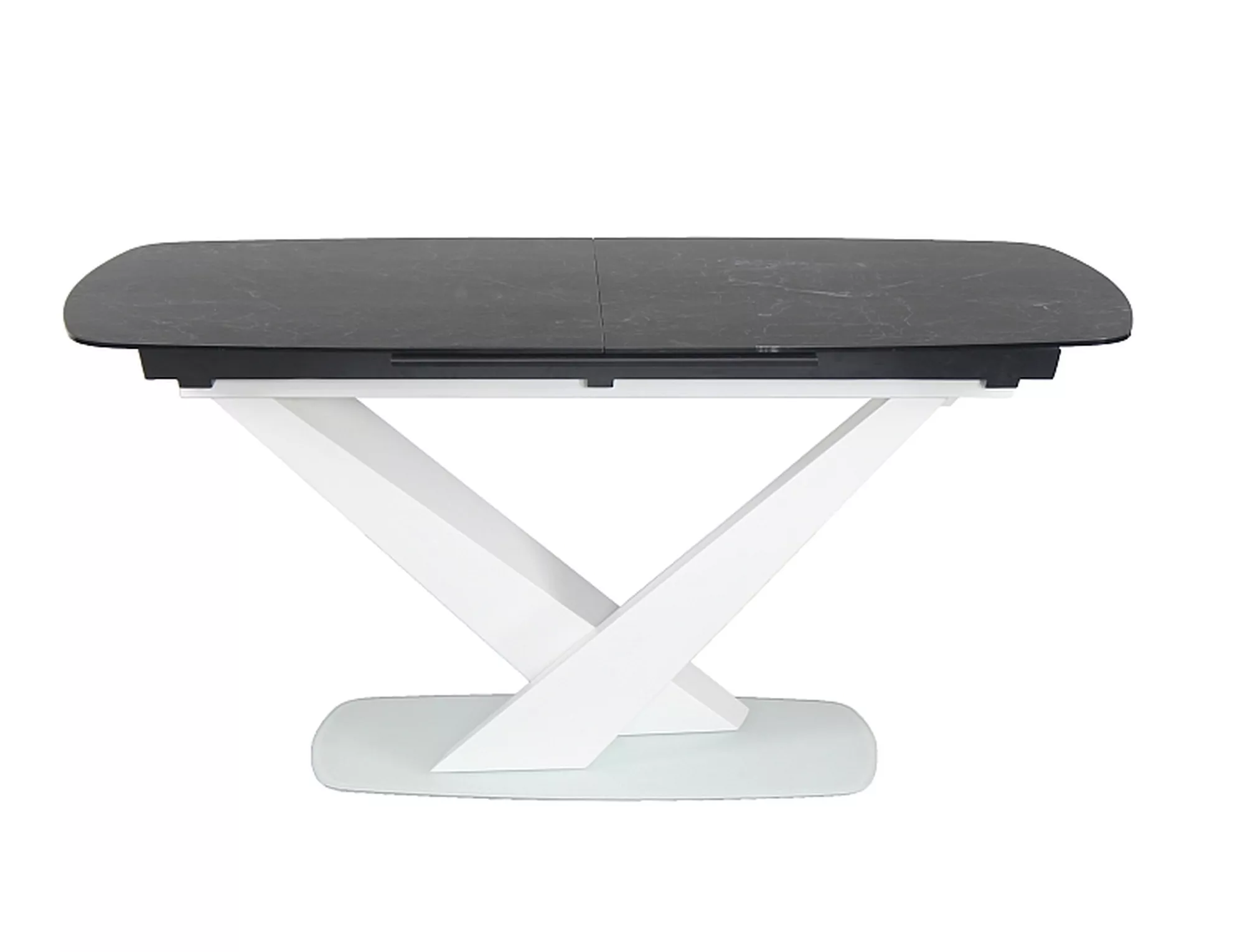 Стол раздвижной, столешница: закаленное стекло + итальянская керамика, каркас: МДФ + стекло, цвет: мрамор графит/белый матовый.