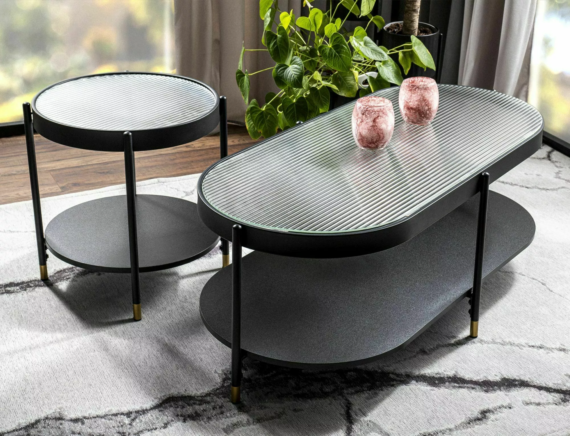 Столик журнальный, столешница: стекло, каркас: металл, цвет: прозрачный/черный матовый.