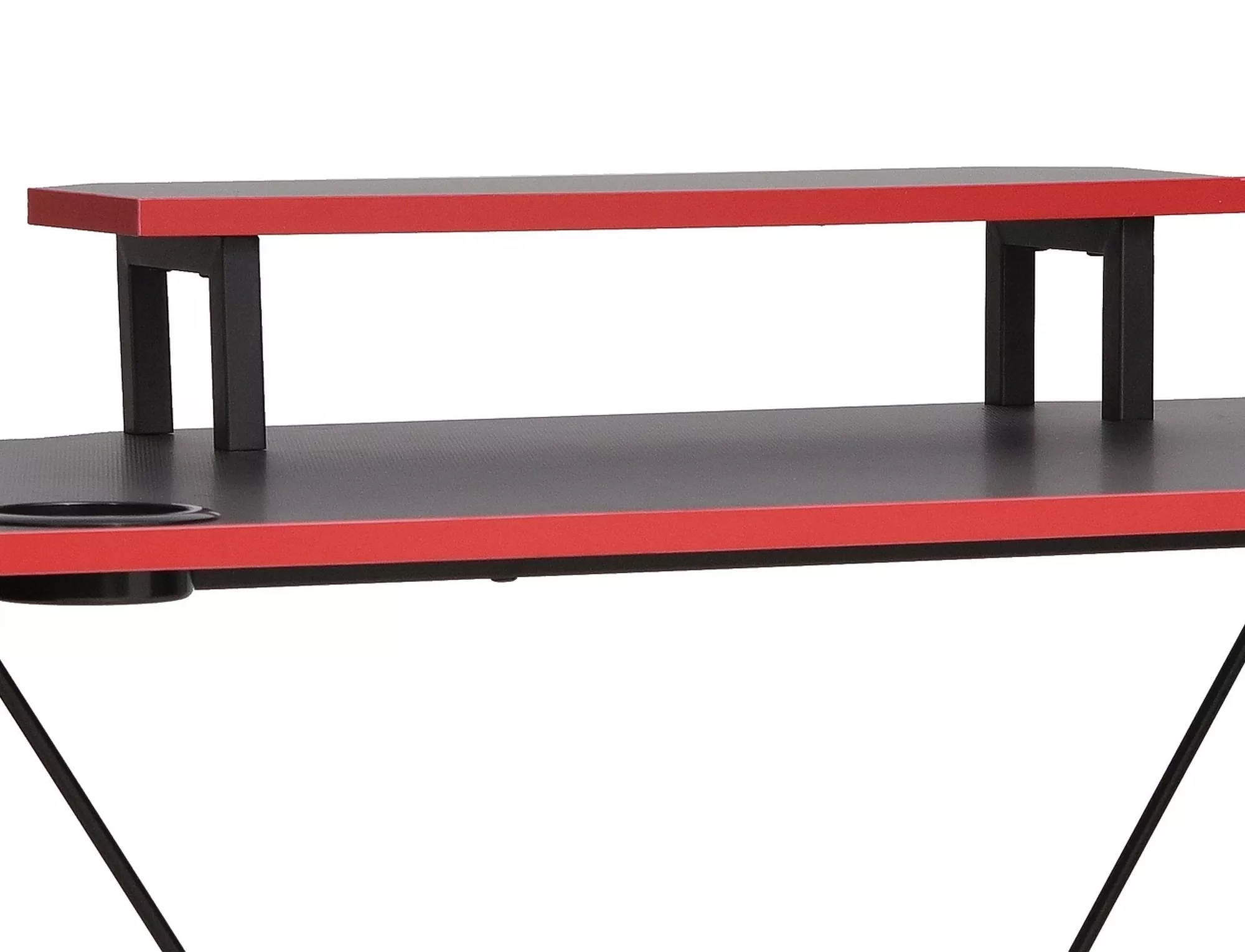Письменный стол, столешница: ламинат, каркас: металл, цвет: черный + красная верхняя кромка. Подстаканник, наушники. Высота с удлинителем: 88см.
