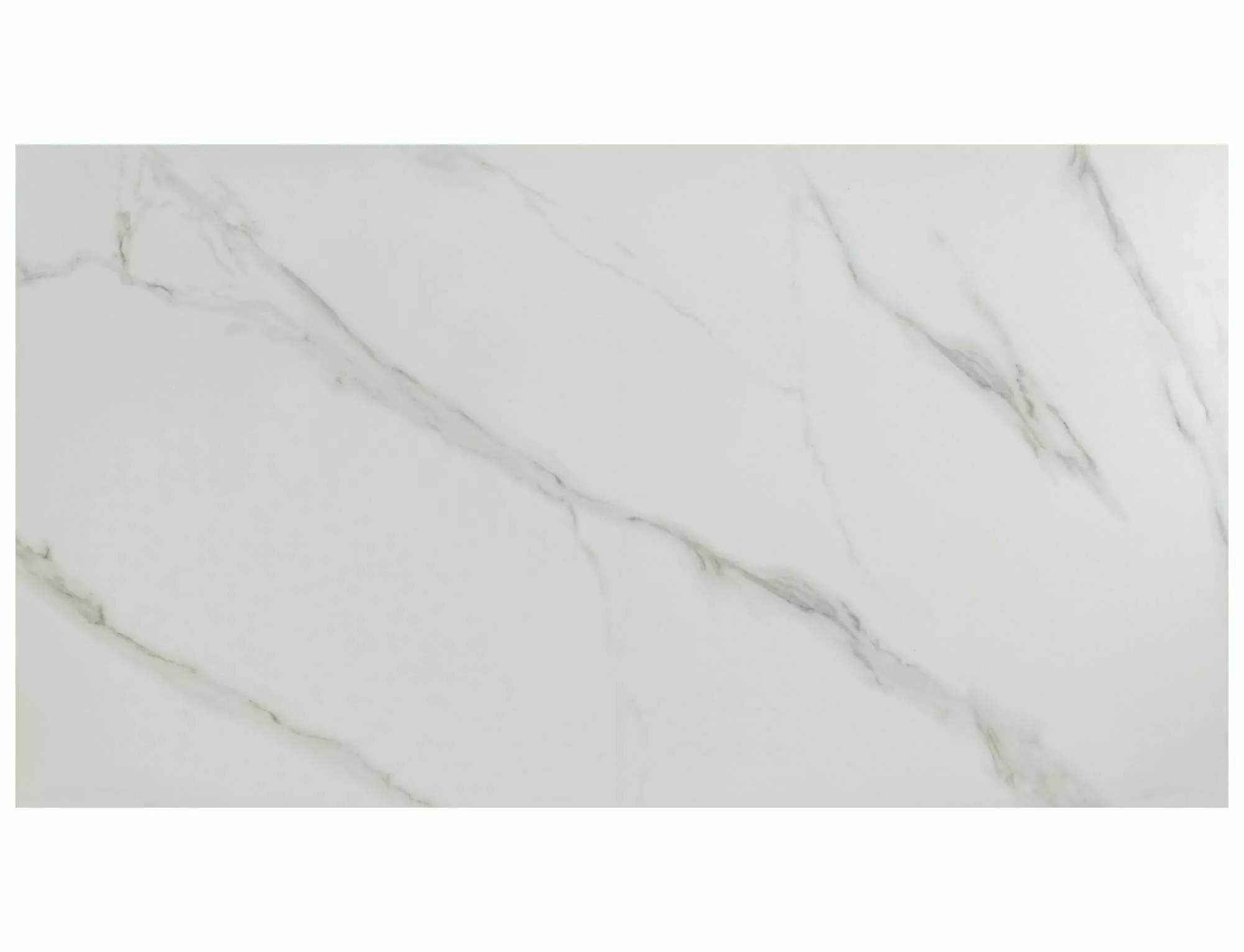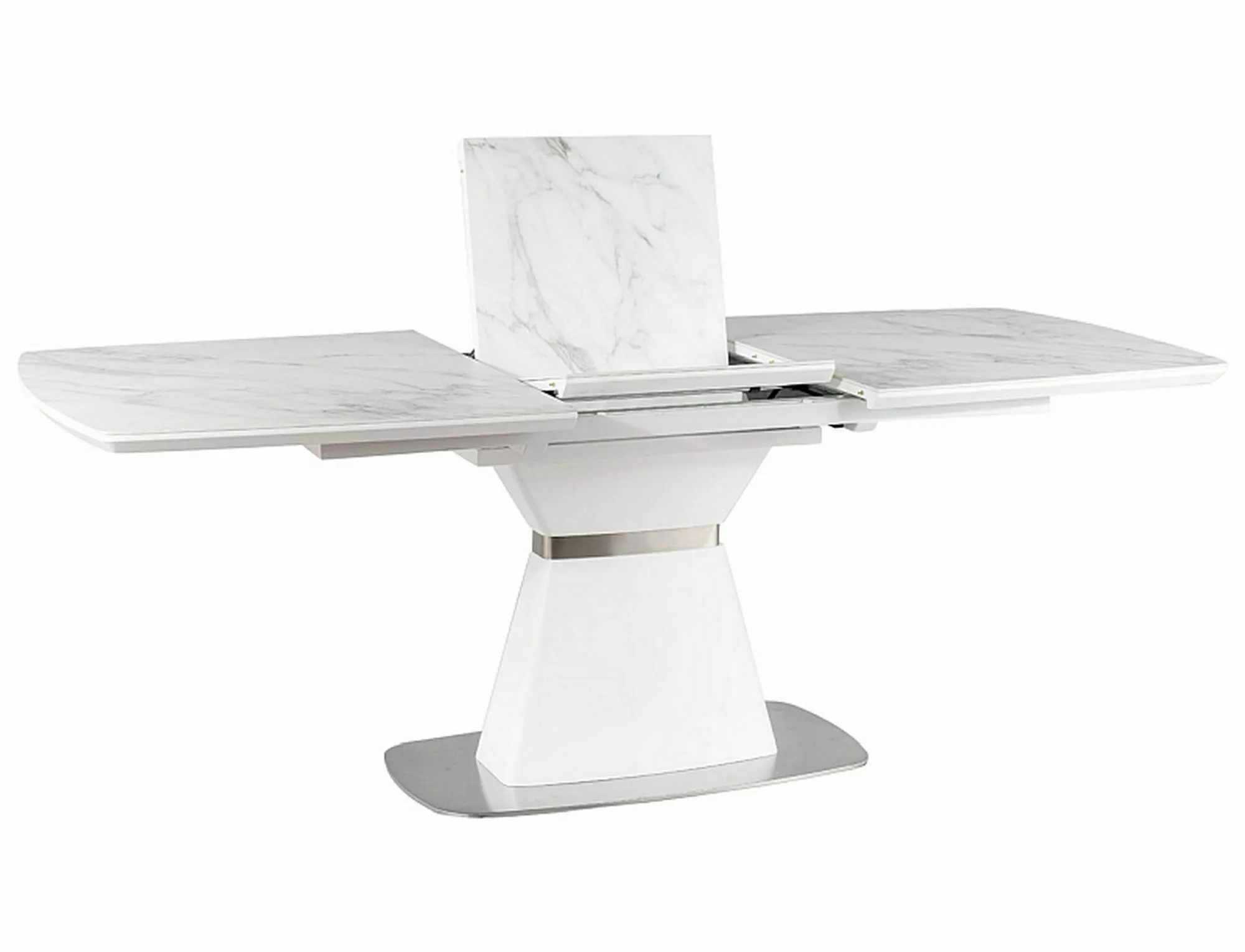 Стол раздвижной, столешница: МДФ + керамика, эффект мрамора, каркас: МДФ + матовая сталь, цвет: белый мрамор/белый матовый.