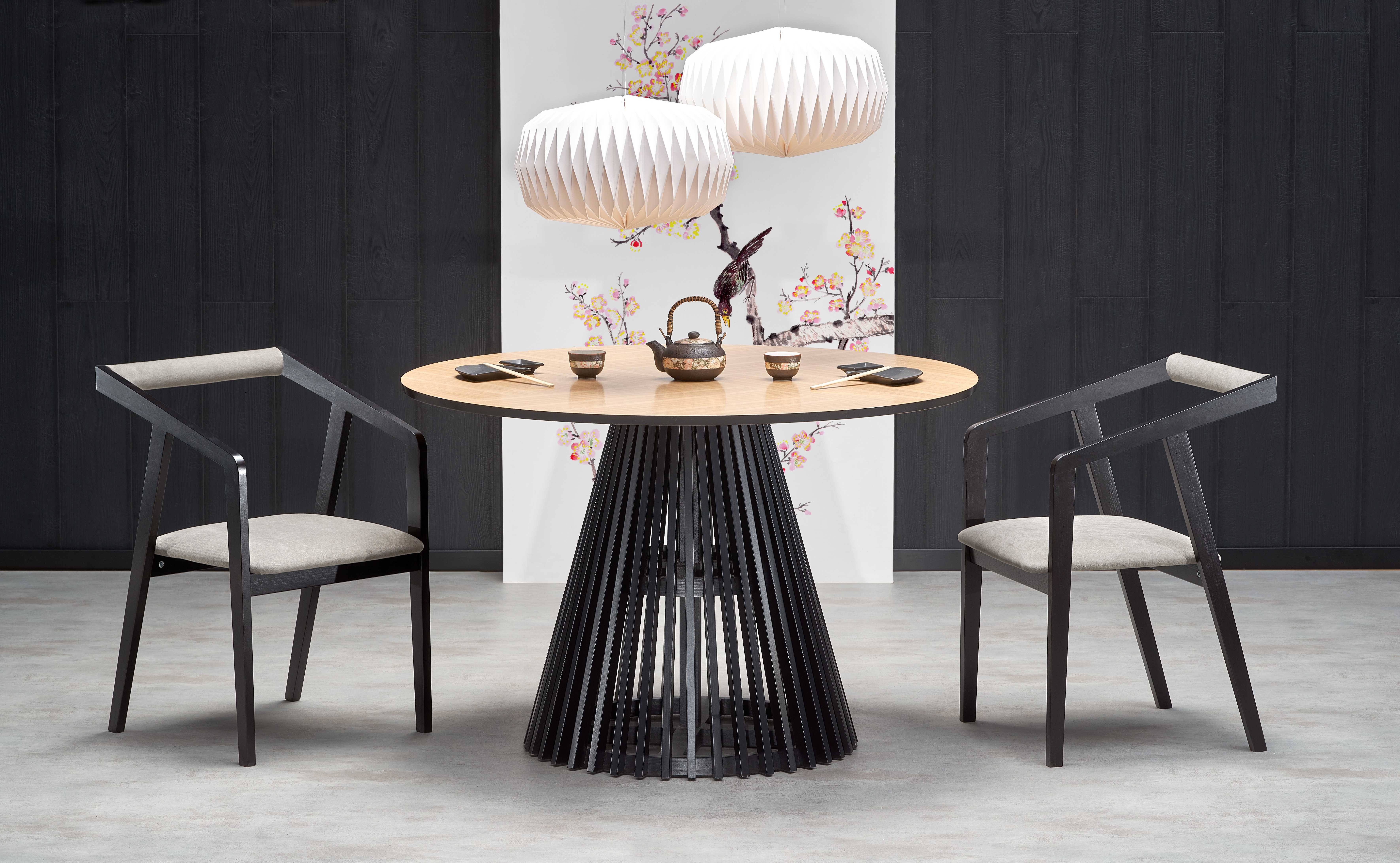 размеры: фи120/77 см, материал: МДФ + натуральный шпон — дуб/массив бука/фанера, цвет: столешница — натуральный дуб, ножки — черный