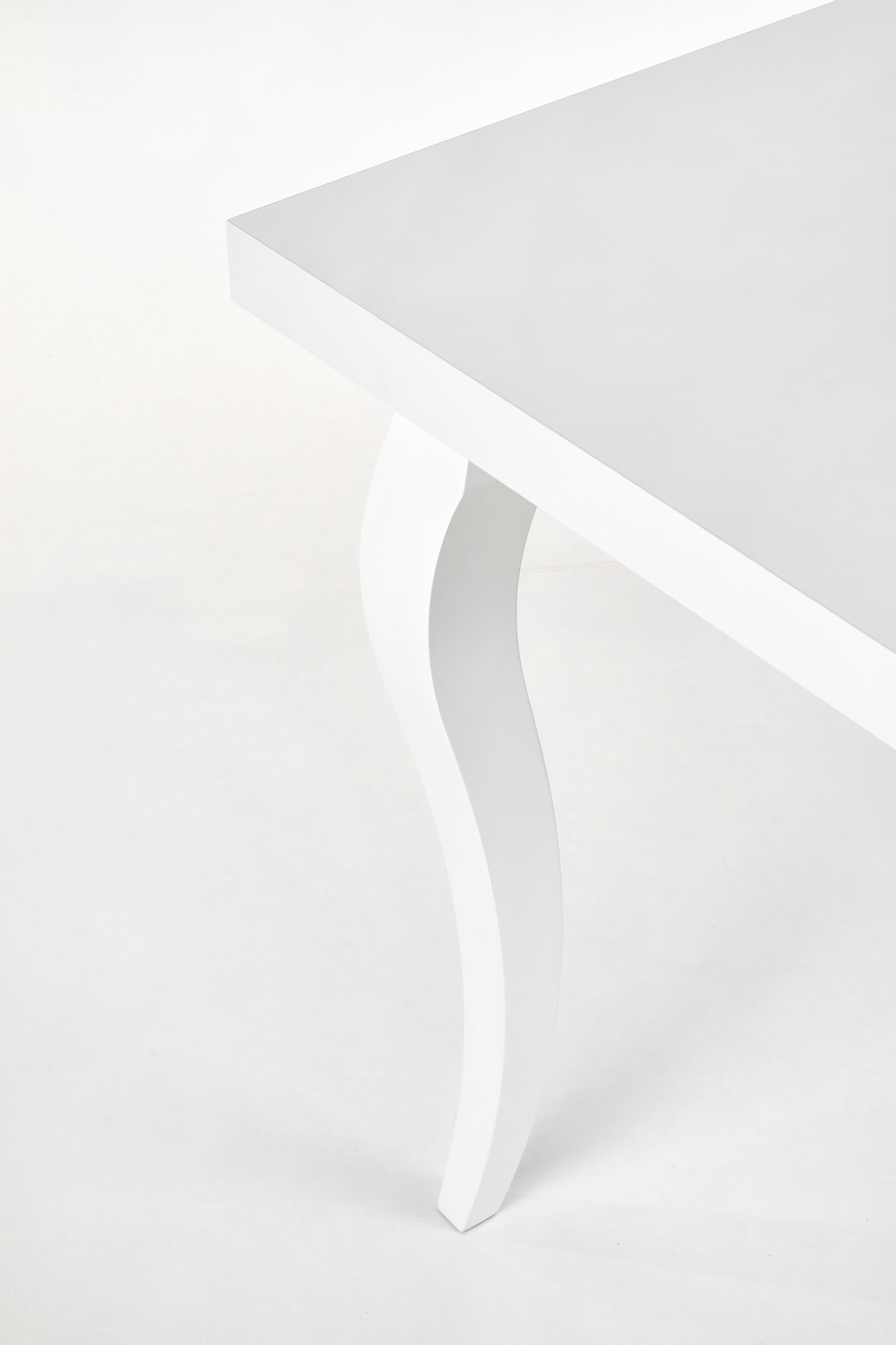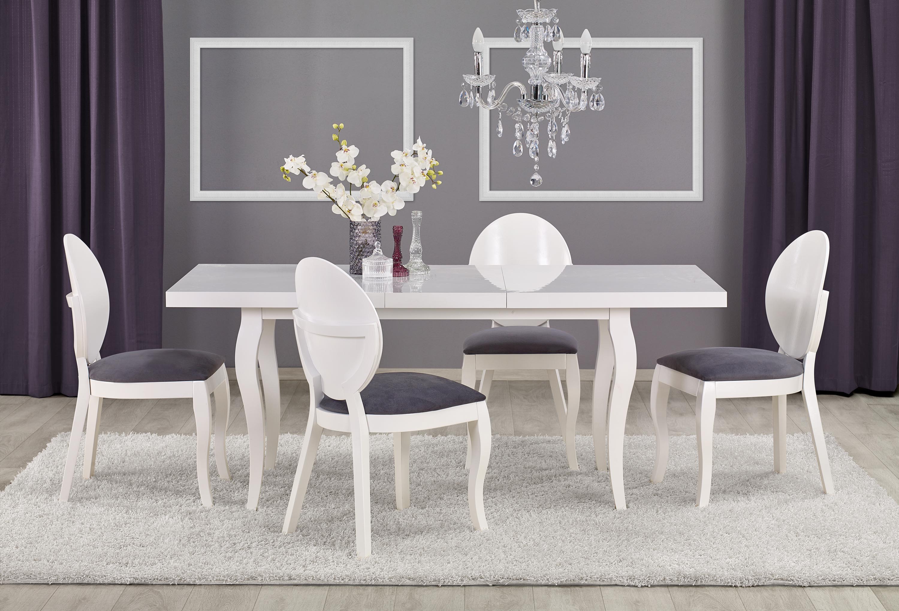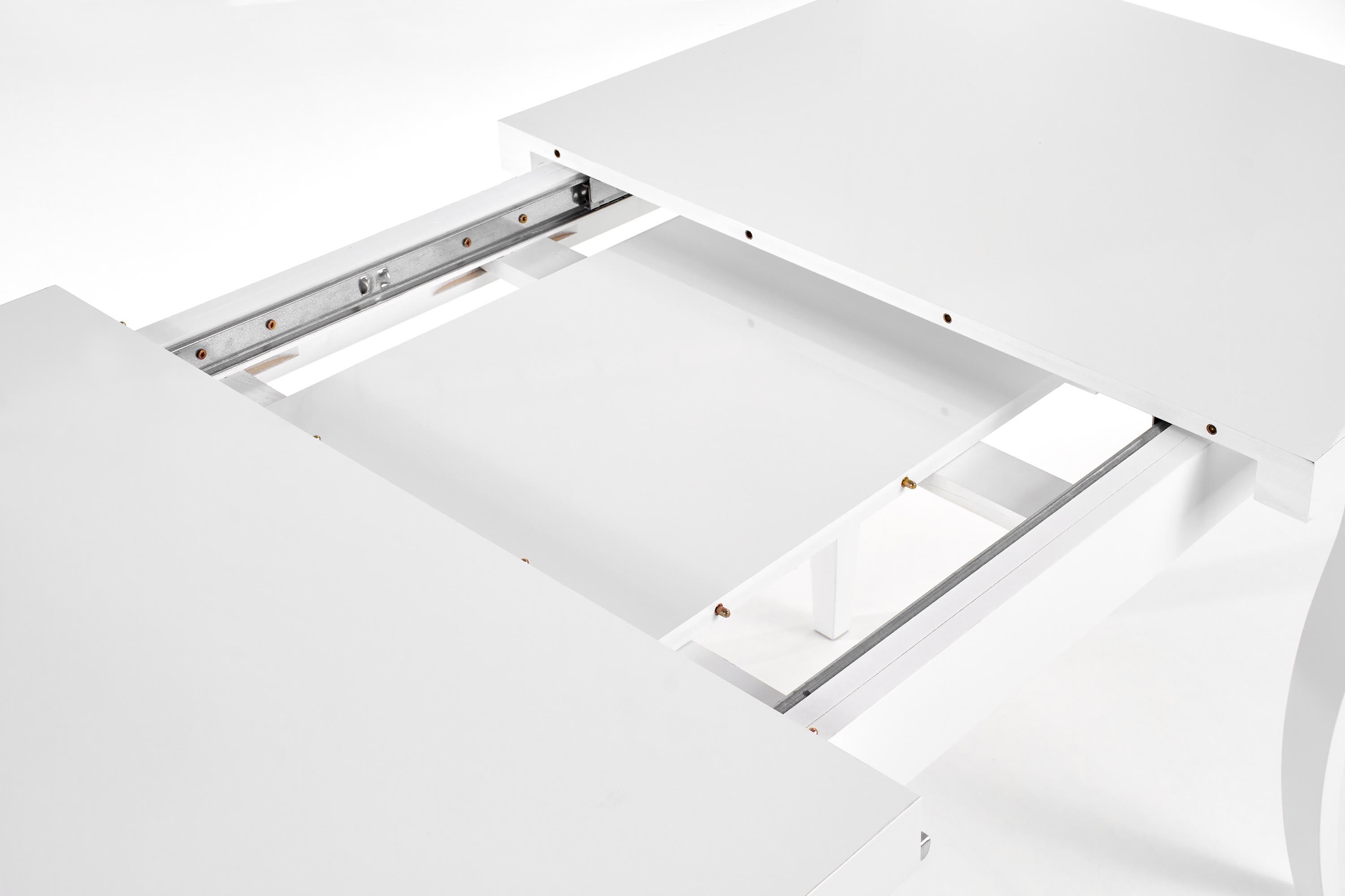 столик-раздвижной, размеры: 140-180/80/75 см, материал: столешница — ламинированный МДФ + кромки АБС, ножки — массив бука, цвет: белый