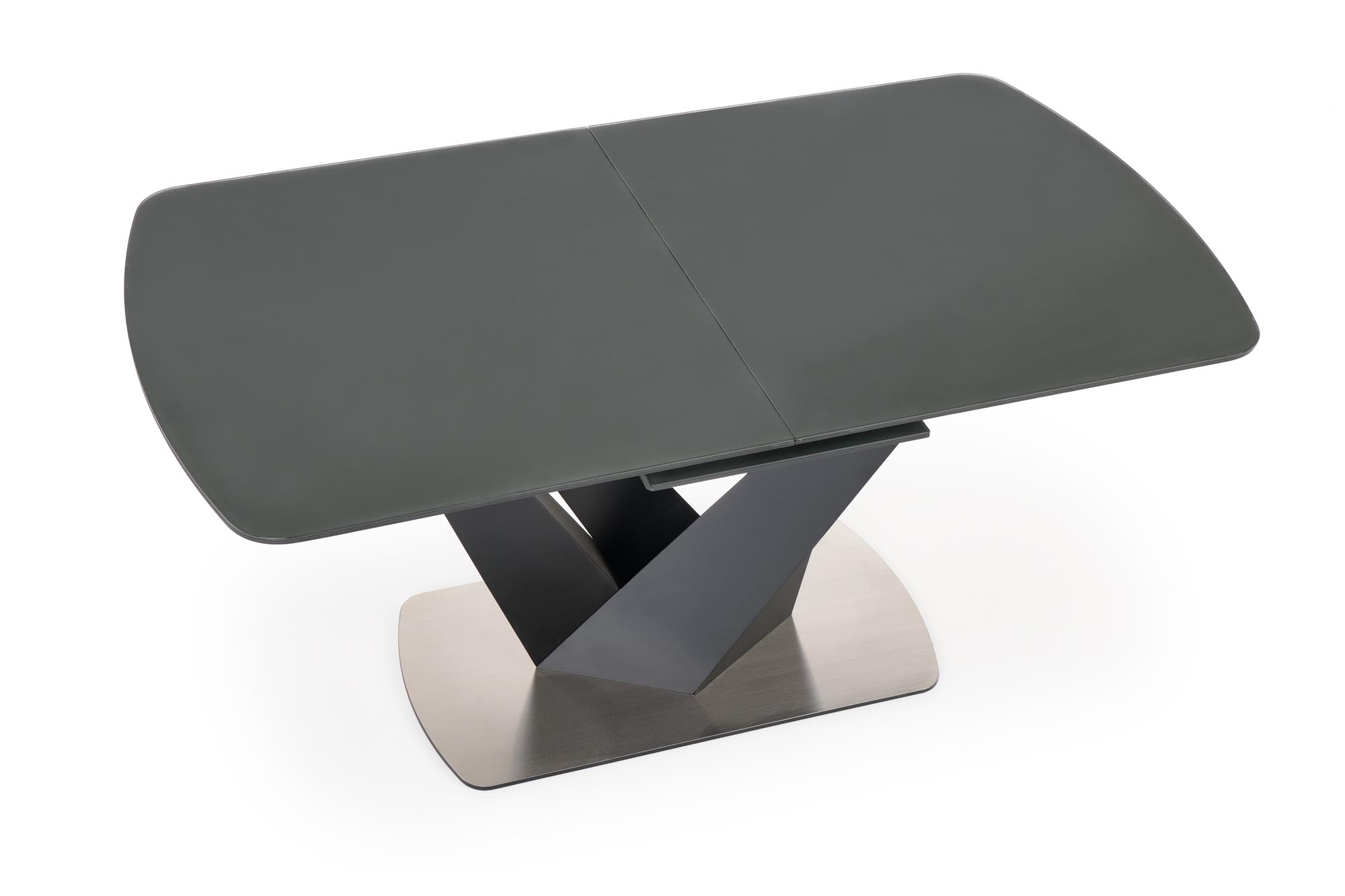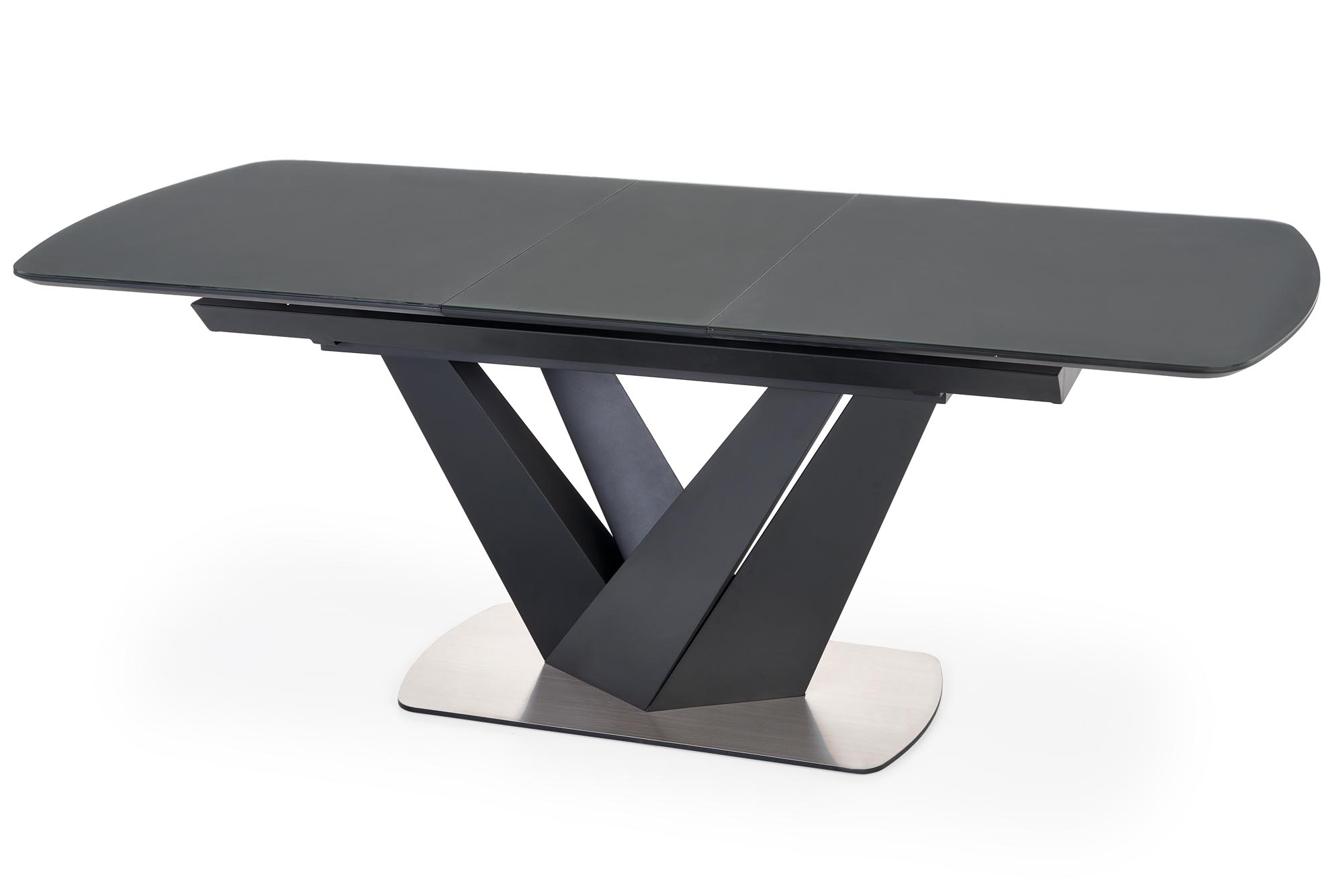 размеры: 160-200/90/77 см, столик-раздвижной, материал: стекло/лак МДФ — матовый/нержавеющая сталь, цвет: столешница — темно-серый, ножки — черный