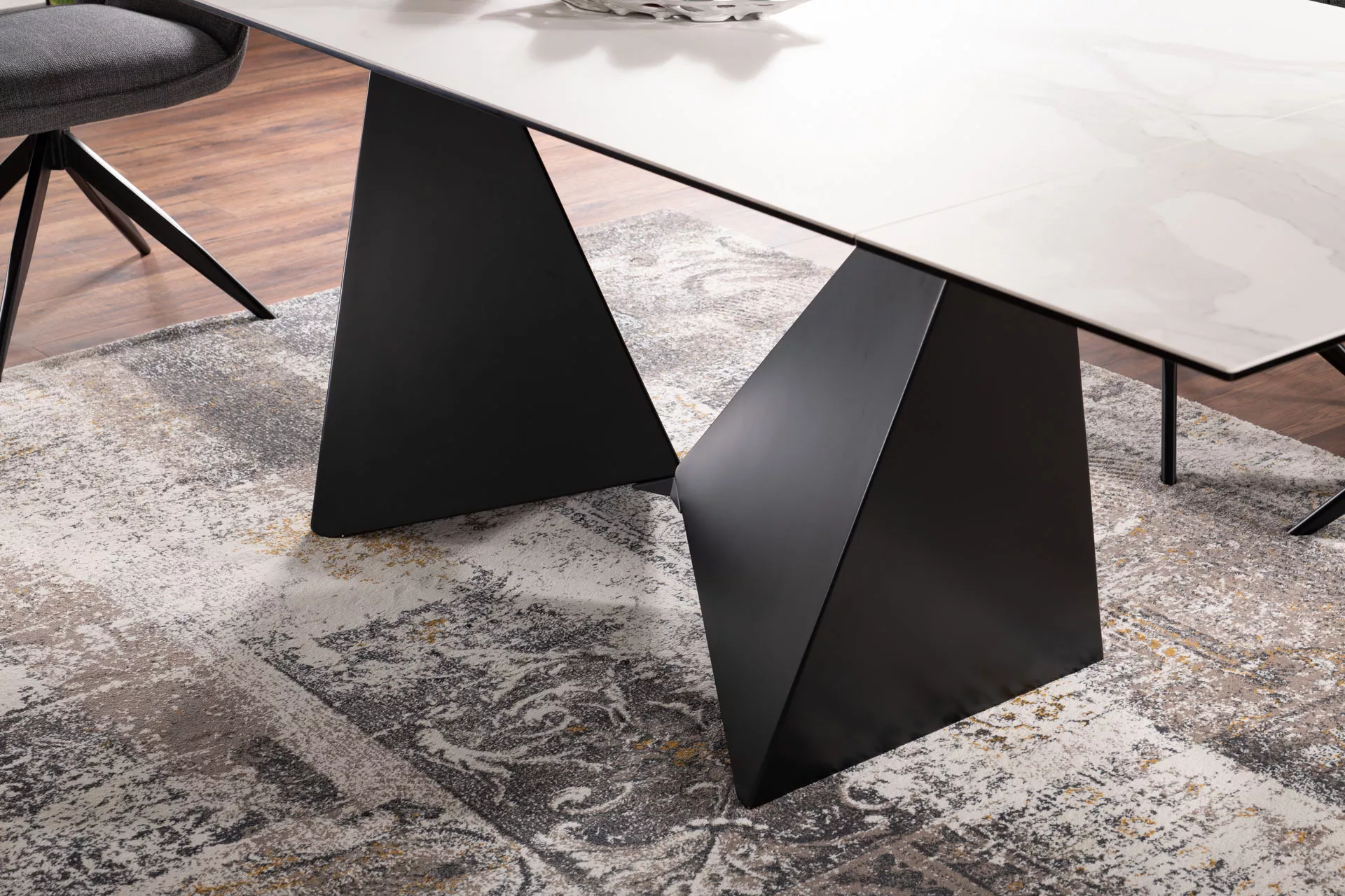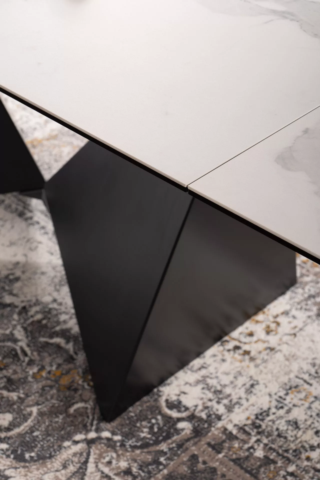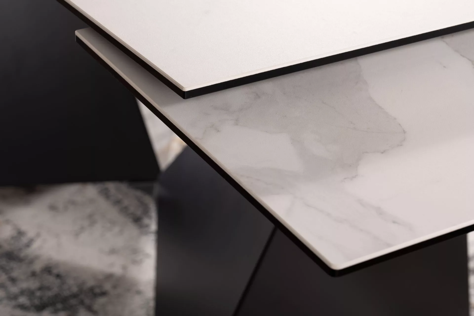 Стол раздвижной, столешница: закаленное стекло + керамика STATUARIO VENATO, каркас: МДФ, цвет: белый матовый/черный матовый.
