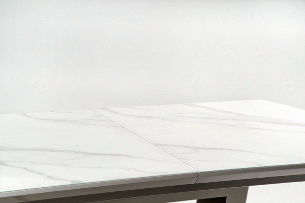 столик-раздвижной, размеры: 160-200/90/76 см, материал: стекло/лакированный МДФ/нержавеющая сталь, цвет: белый мрамор — белый
