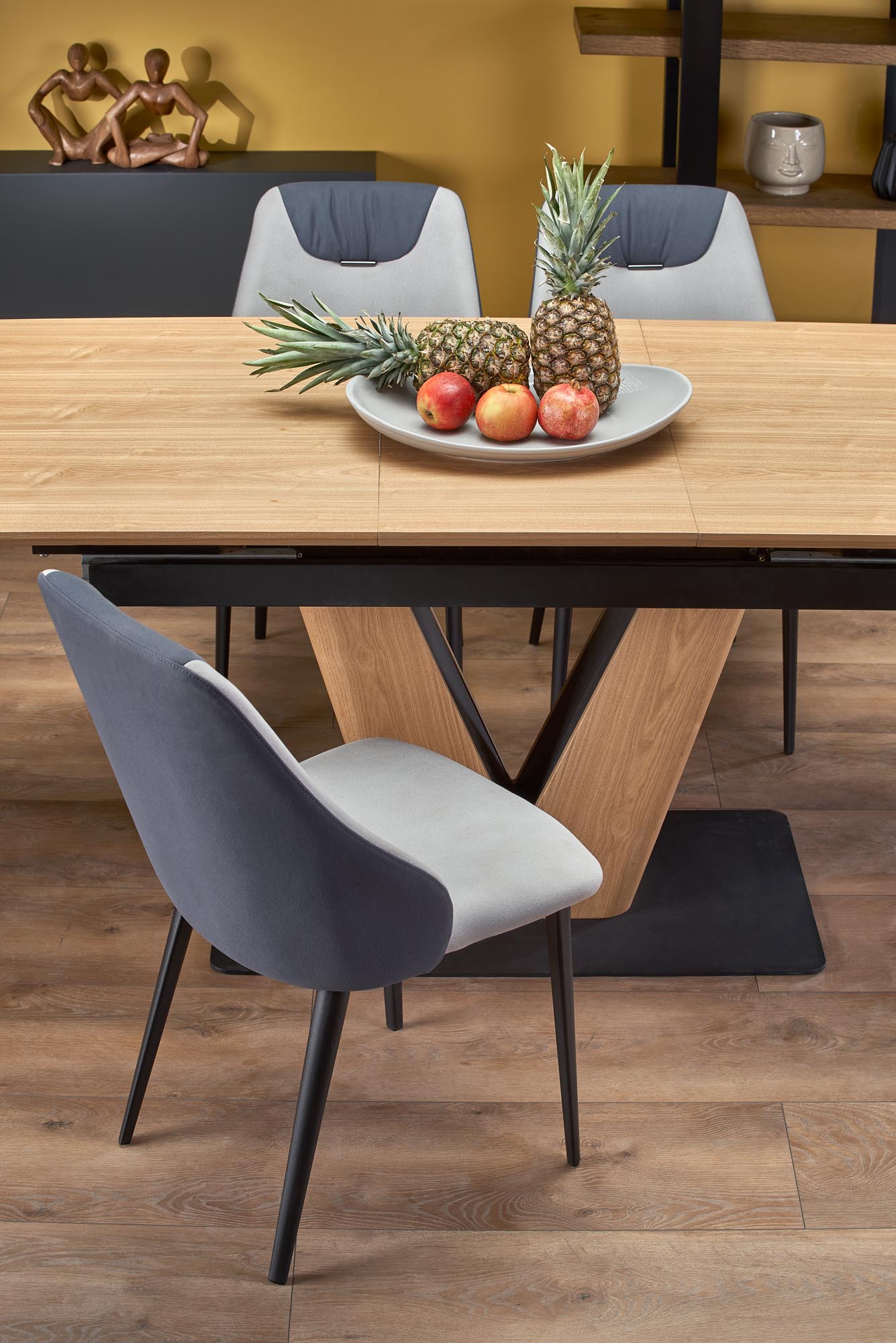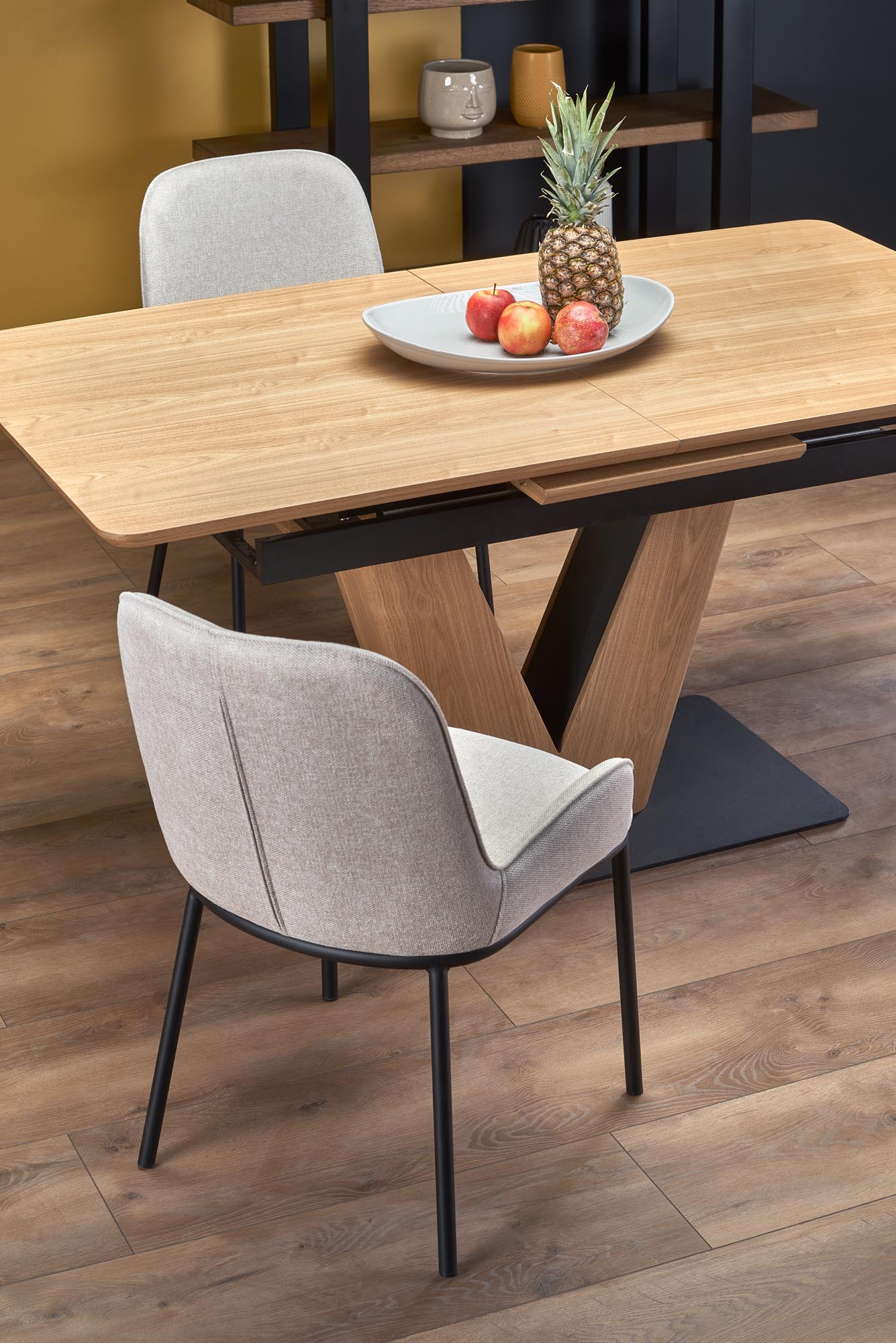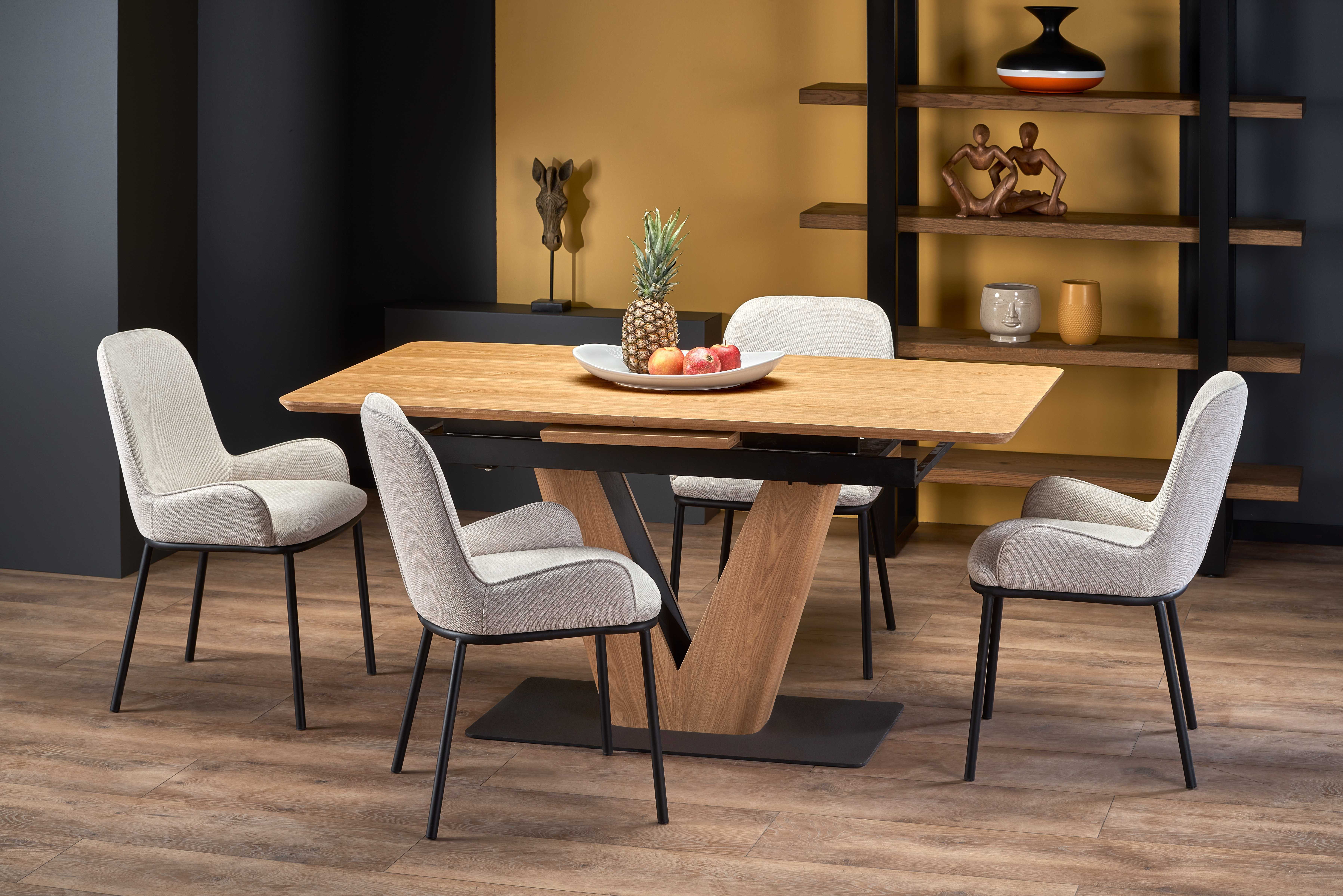 размеры: 160-200/90/77 см, столик-раздвижной, материал: МДФ + натуральный шпон/лакированный МДФ/сталь с порошковой покраской, цвет: столешница – дуб натуральный, ножки – дуб натуральный/черный