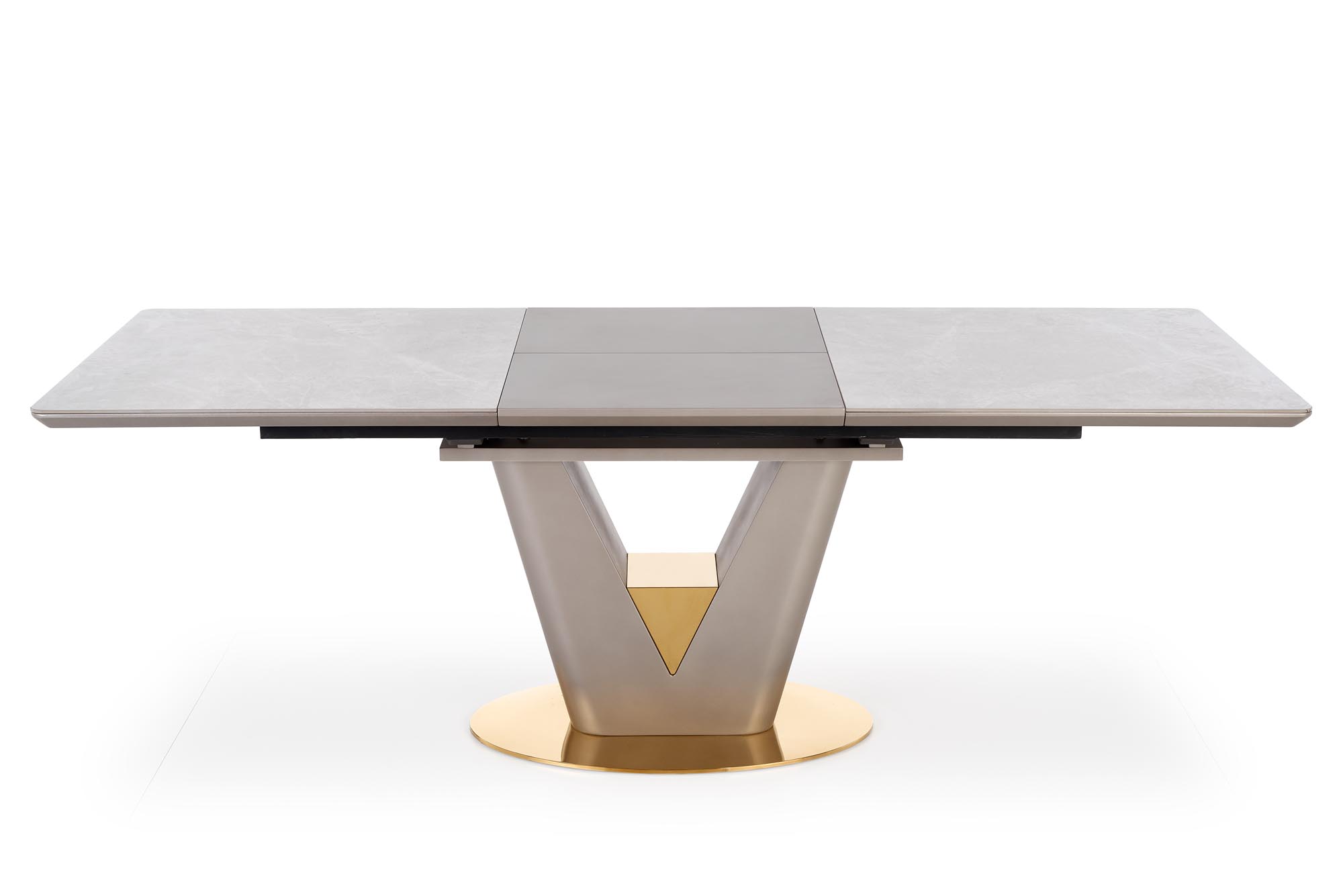 размеры: 160-220/90/76 см, столик-раздвижной, материал: керамика/лакированный МДФ/хромированная сталь, цвет: столешница – серый мрамор, ножки – светло-серый/золотой
