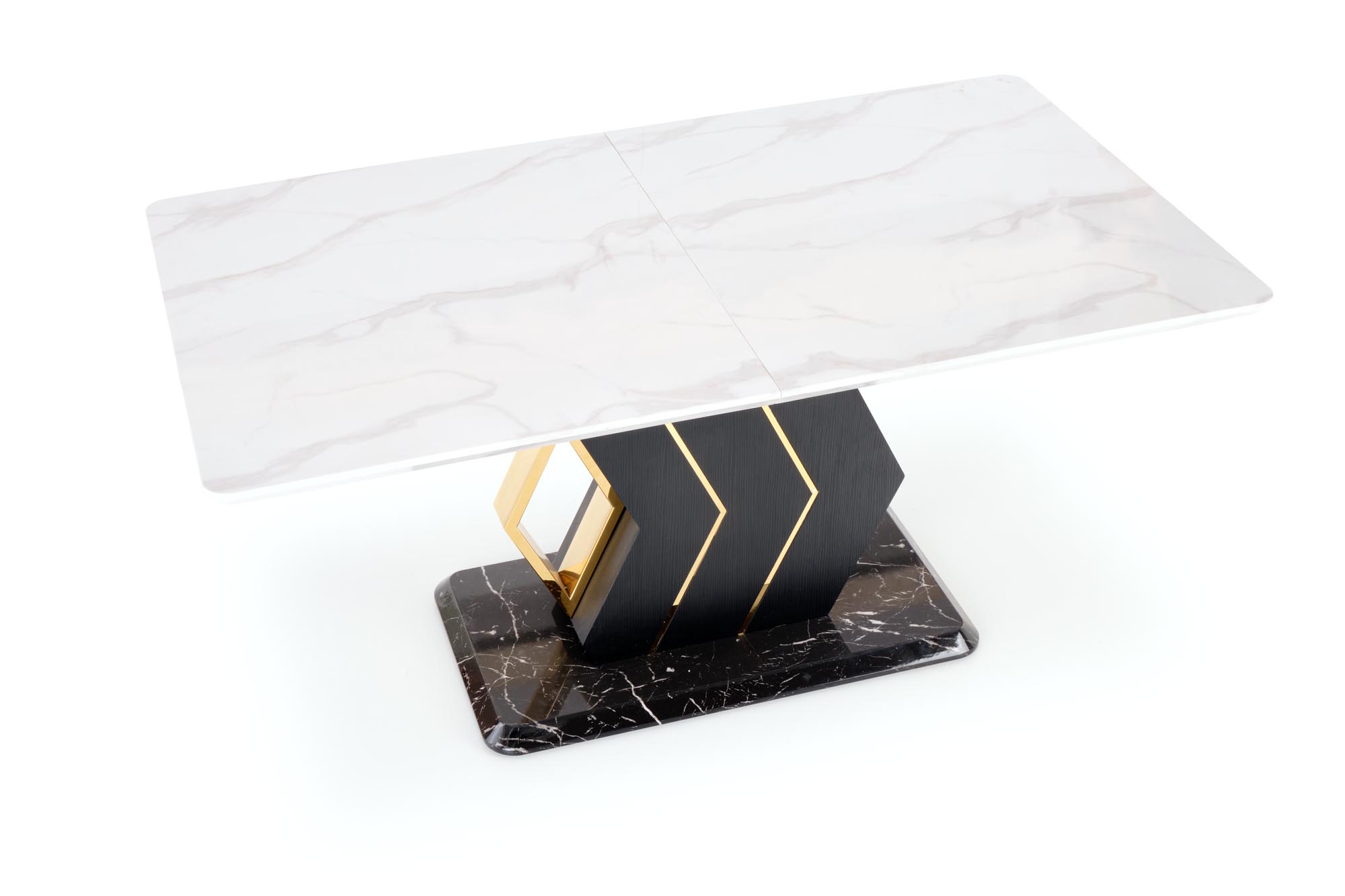 размеры: 160-200/90/77 см, столик-раздвижной, материал: ламинированный МДФ/лакированный МДФ/хромированная сталь, цвет: столешница – белый мрамор, ножки – черный/золотой