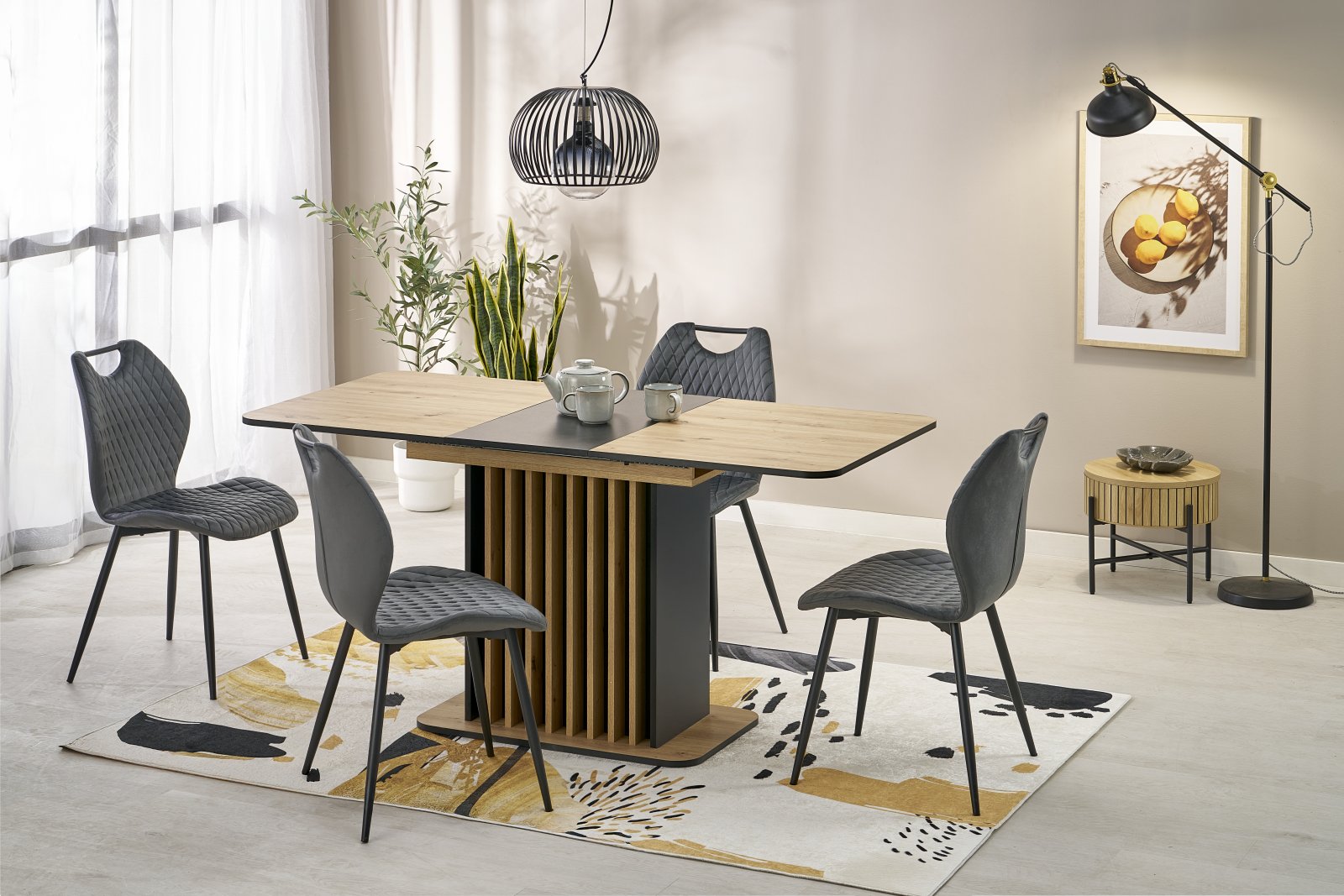 Размеры: 120-158/77/77 см, столик-раздвижной, материал: ЛДСП, цвет: столешница — имитация дуб, ножки — имитация дуб /черный.