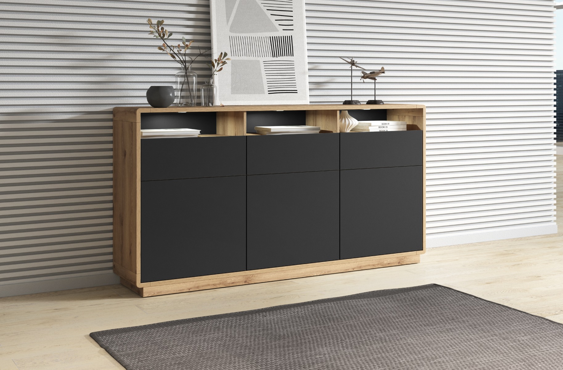 - Отделка: Дуб Телец/черный матовый.