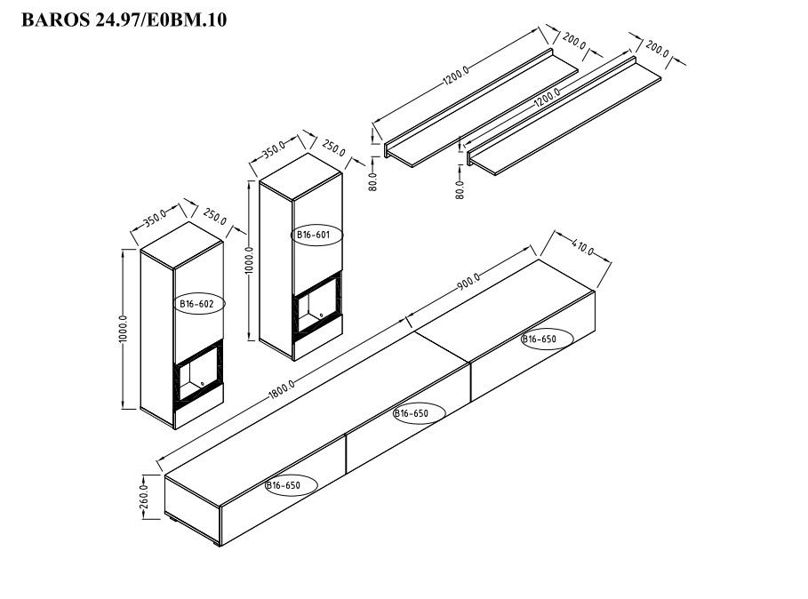 - В комплект входят 2 настенные витрины, 2 полки и подставка под телевизор.