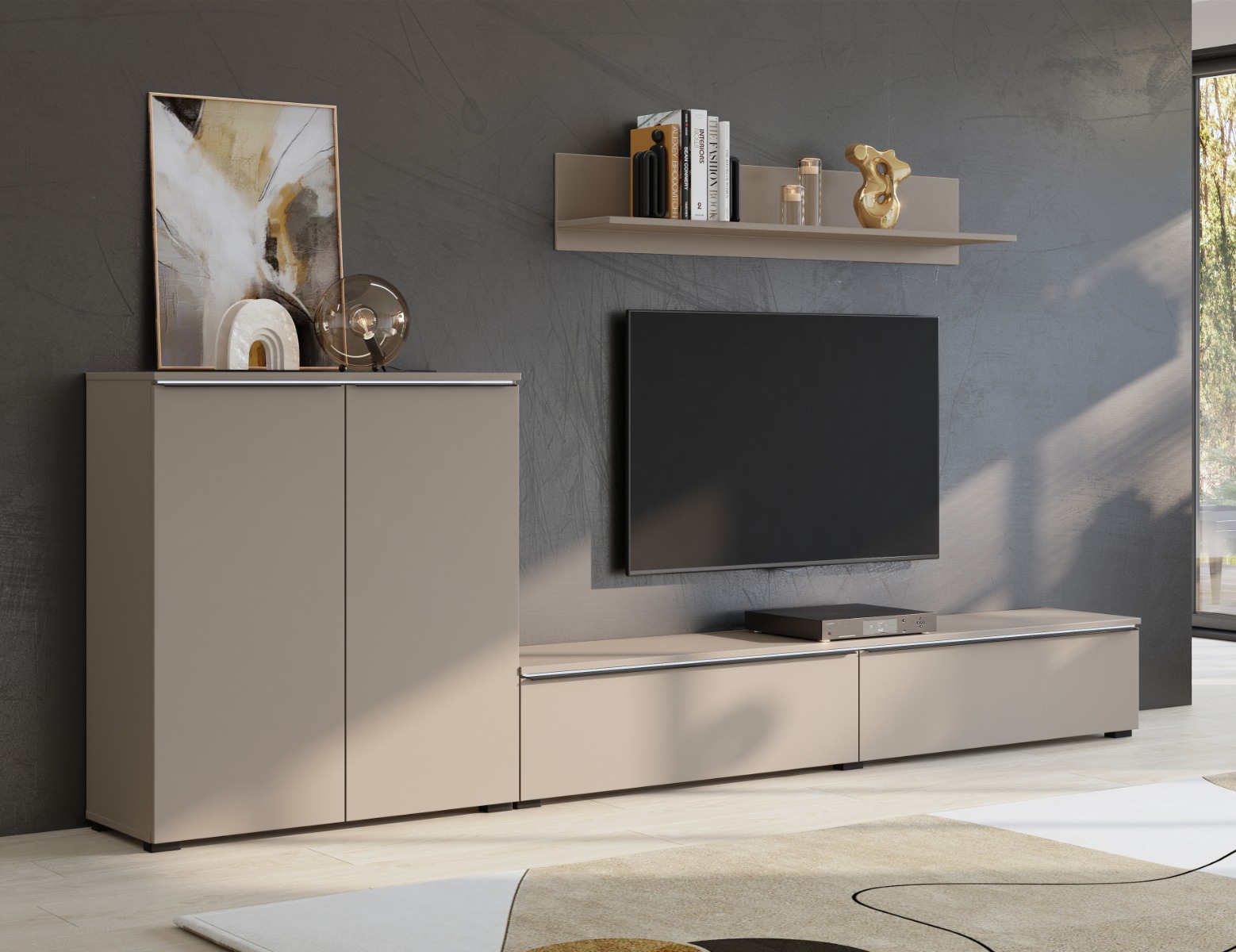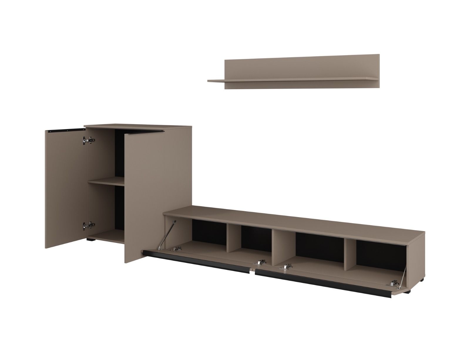 - В комплект входит комод, подставка под телевизор и настенная полка.