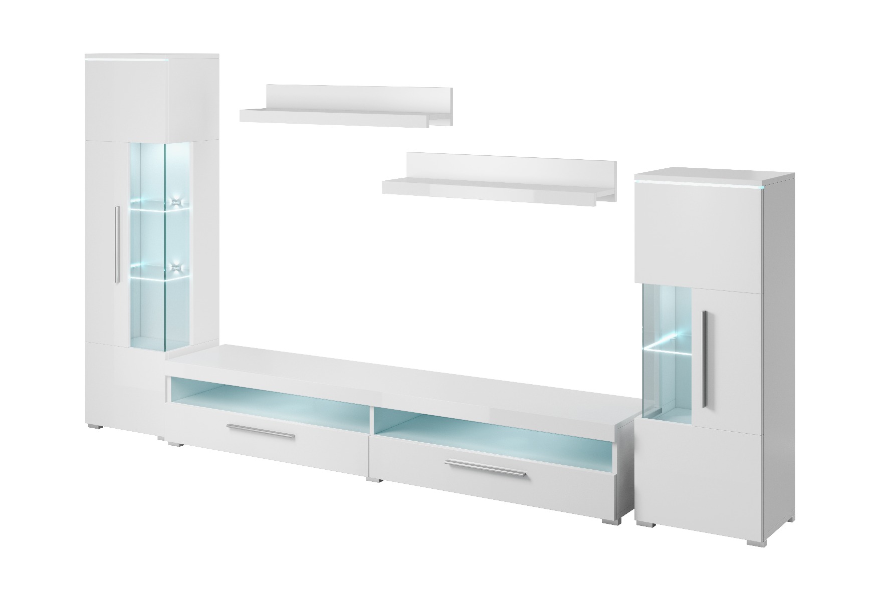 - В комплект входят: 2 витрины, 2 настенные полки, подставка под телевизор.