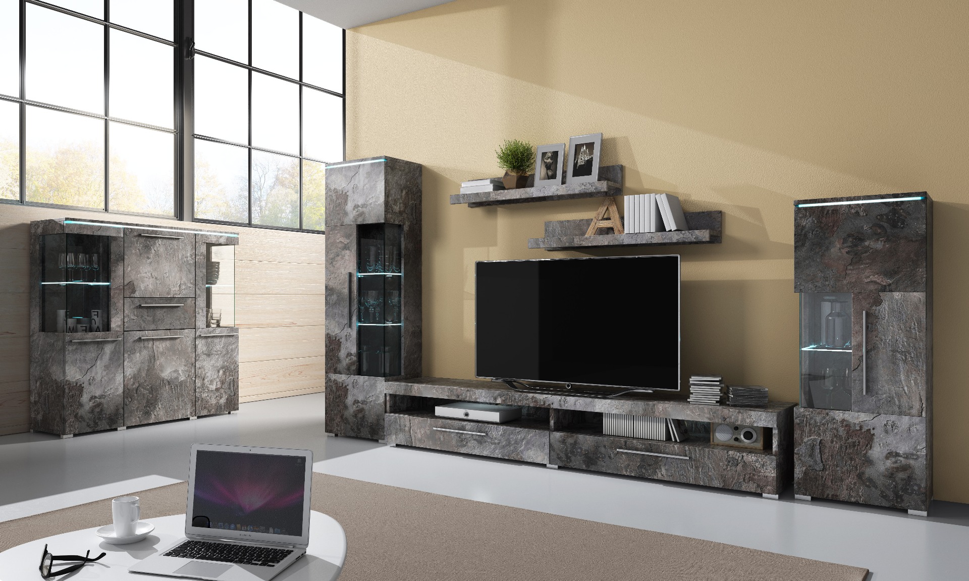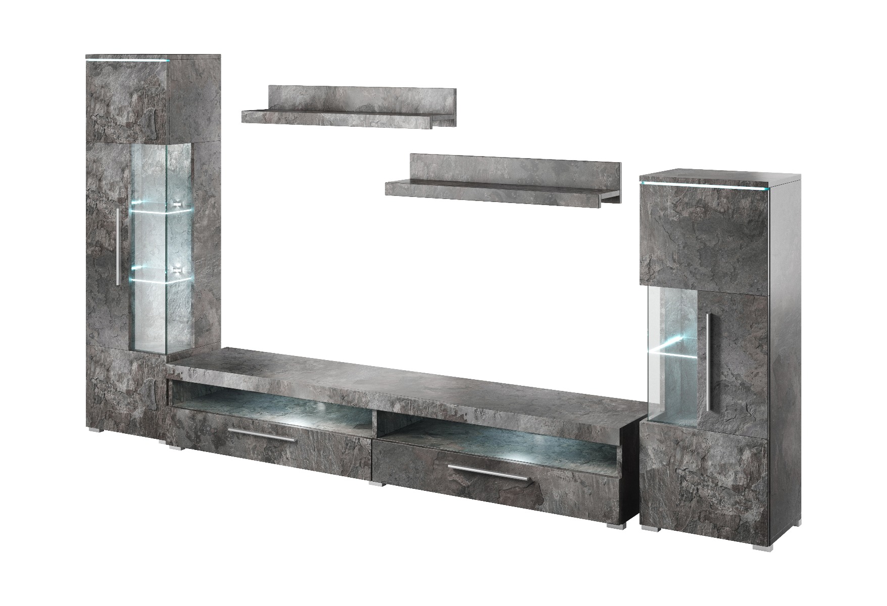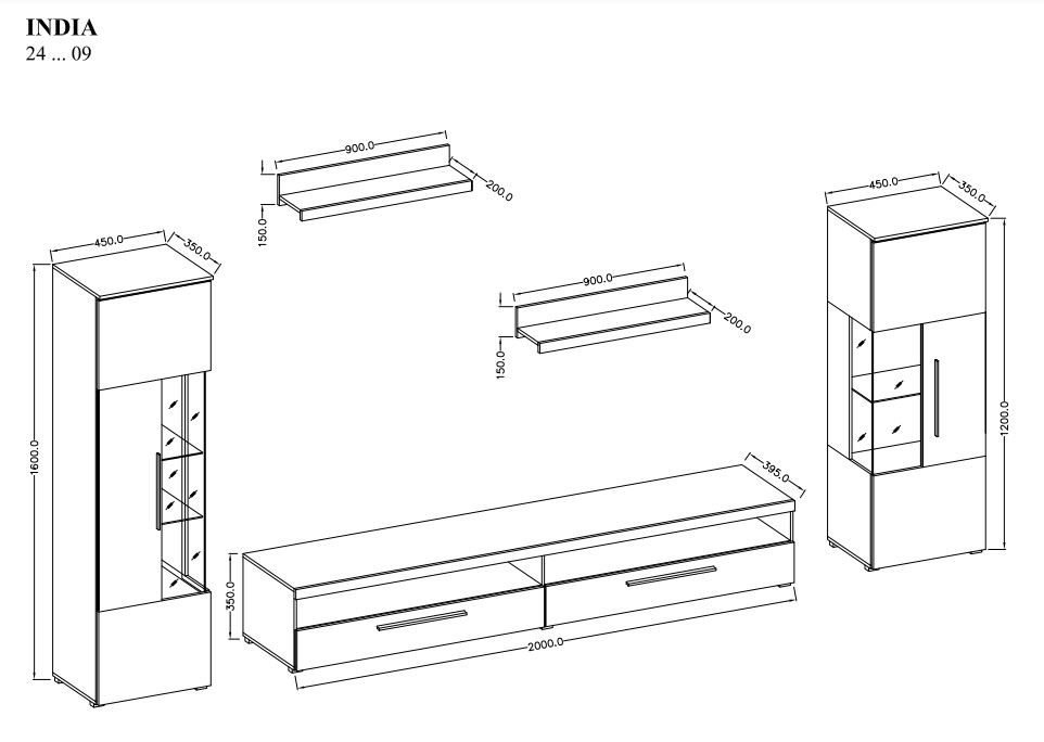 - В комплект входят: 2 витрины, 2 настенные полки, подставка под телевизор.