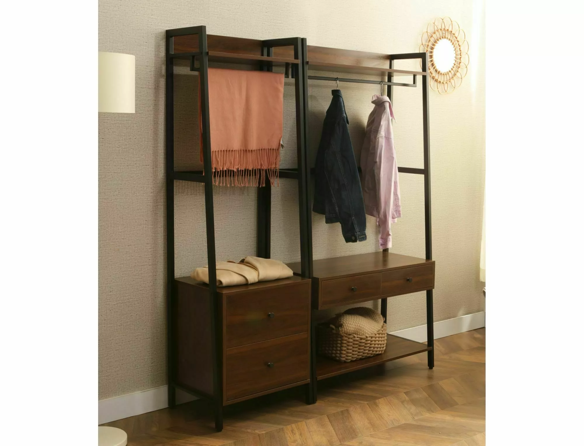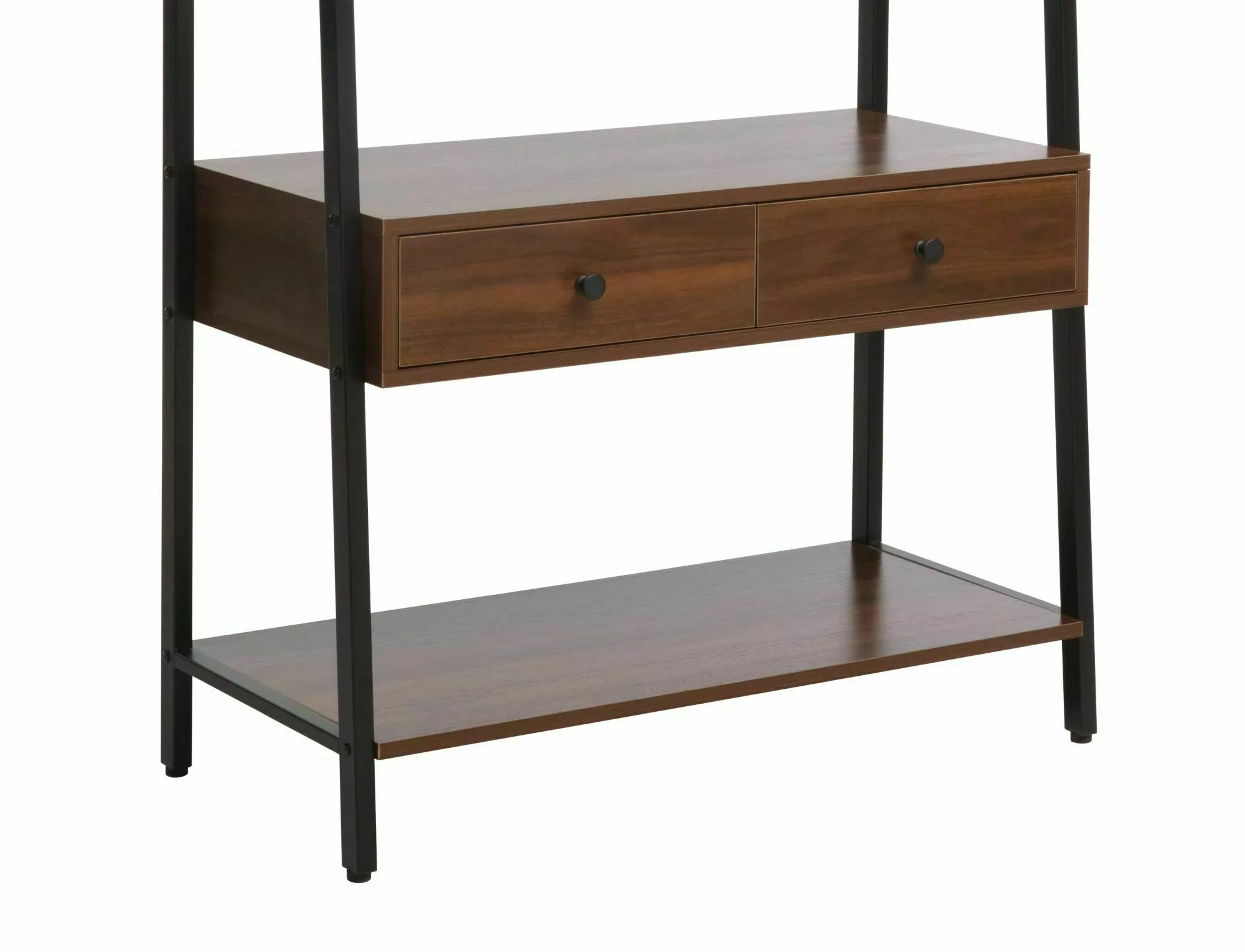 Полка/вешалка, полки: ламинат, каркас: металл, цвет: орех/черный матовый. Два ящика.