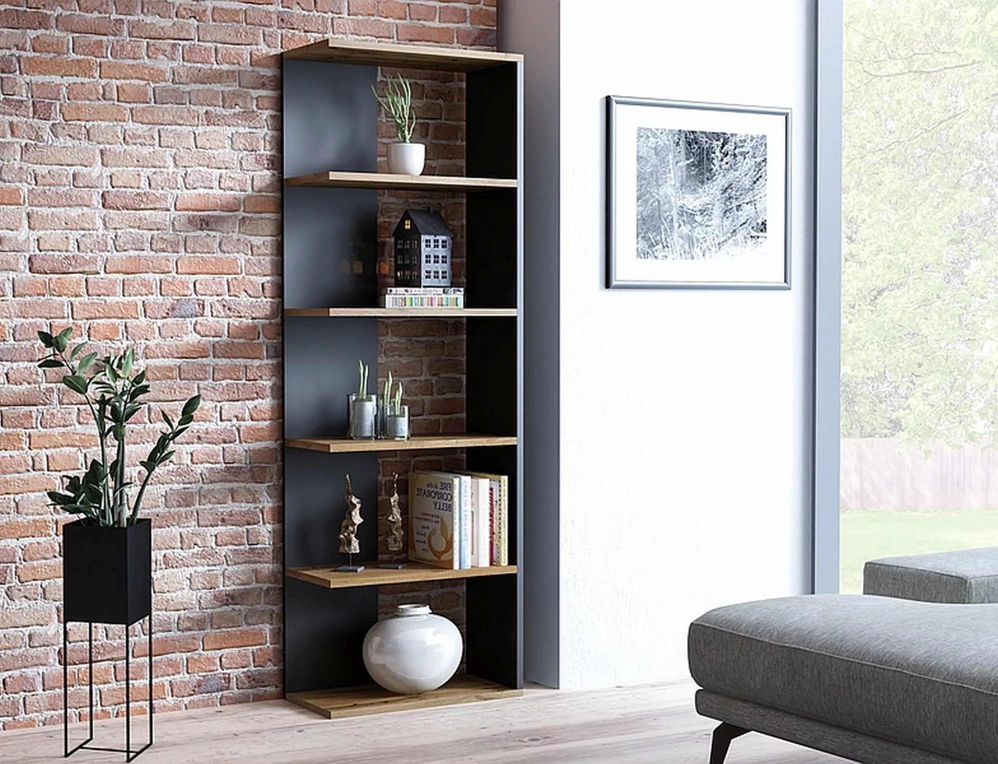 Полка, ламинат, цвет: дуб вотан+черный. Универсальный: левый или правый. Расстояние между полками: 318 мм.