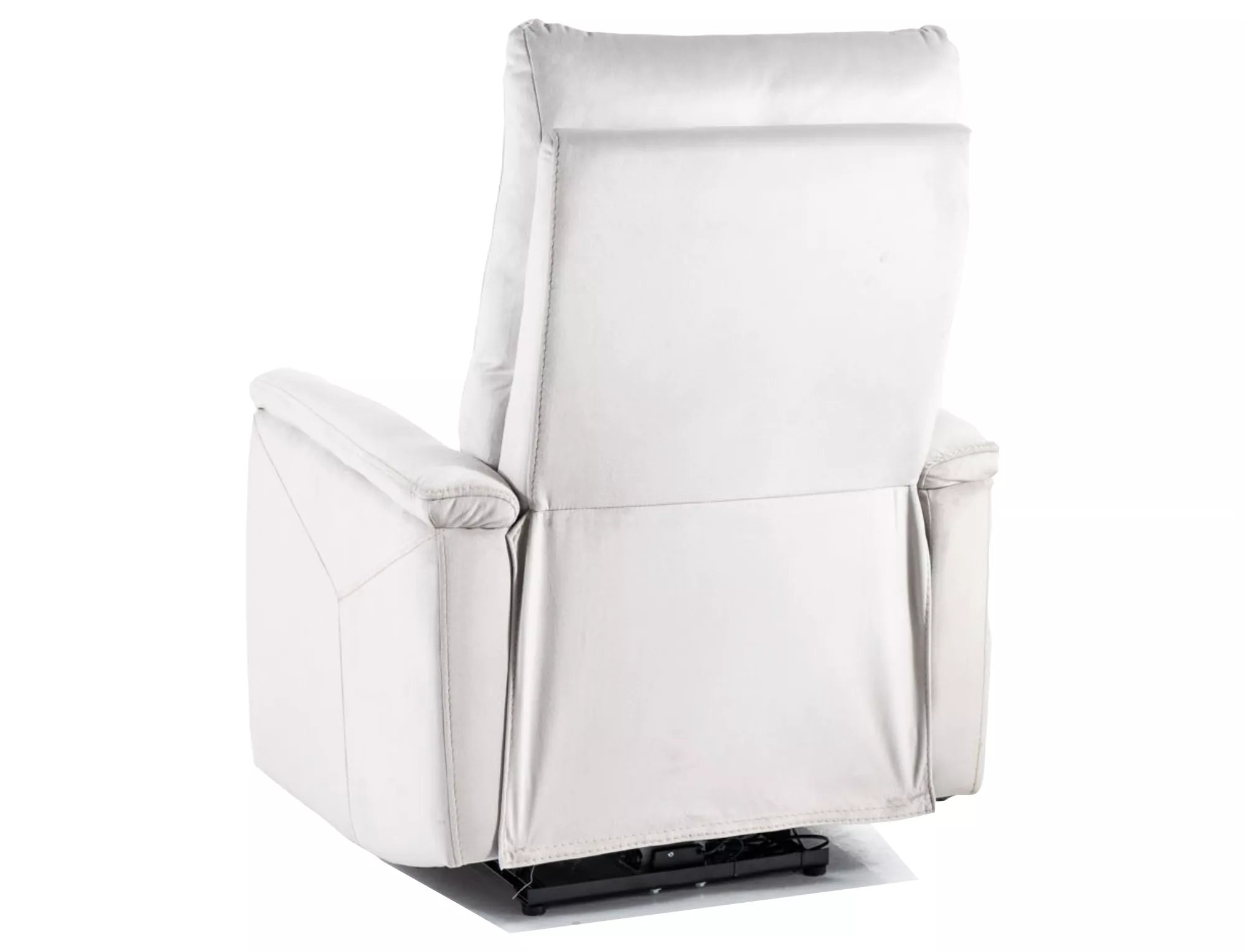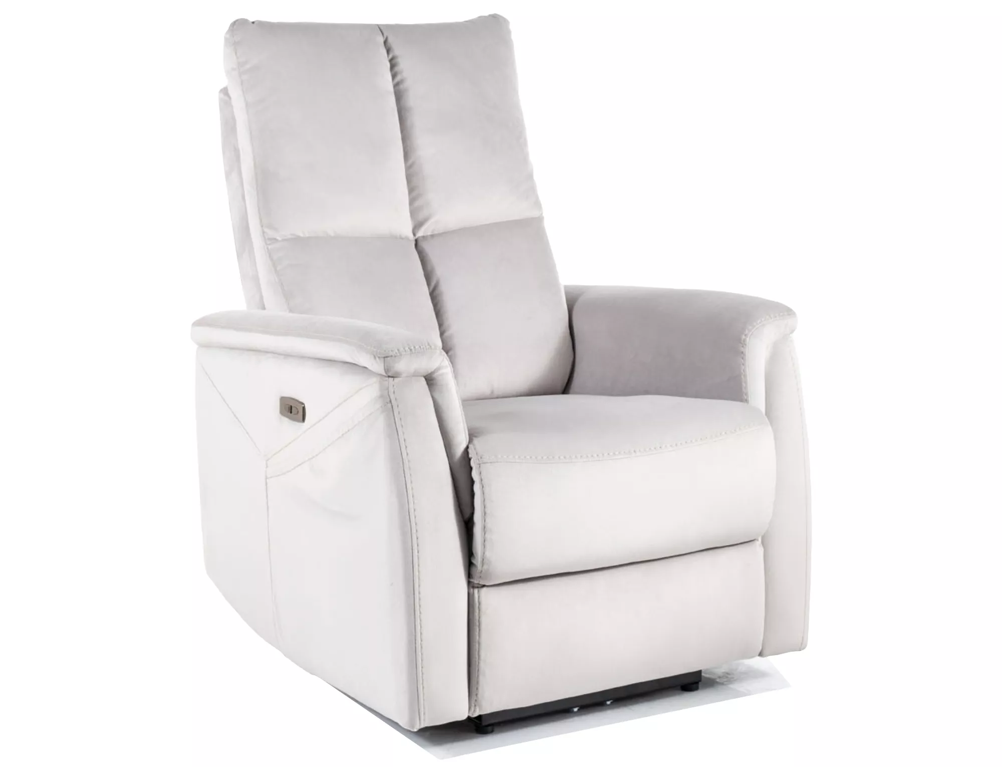 Кресло с электрорегулировкой наклона и функцией массажа, бархатная ткань: Bluvel, цвет: светло-серый 03. Управление наклоном с помощью панели с правой стороны кресла. Панель дополнительно оснащена USB-портом с подсветкой. Функции массажа регулируются с помощью проводного пульта дистанционного управления, в опциях: время работы, выбор зоны и интенсивности массажа, подогрев поясницы. На боковой стороне кресла имеется практичный карман.