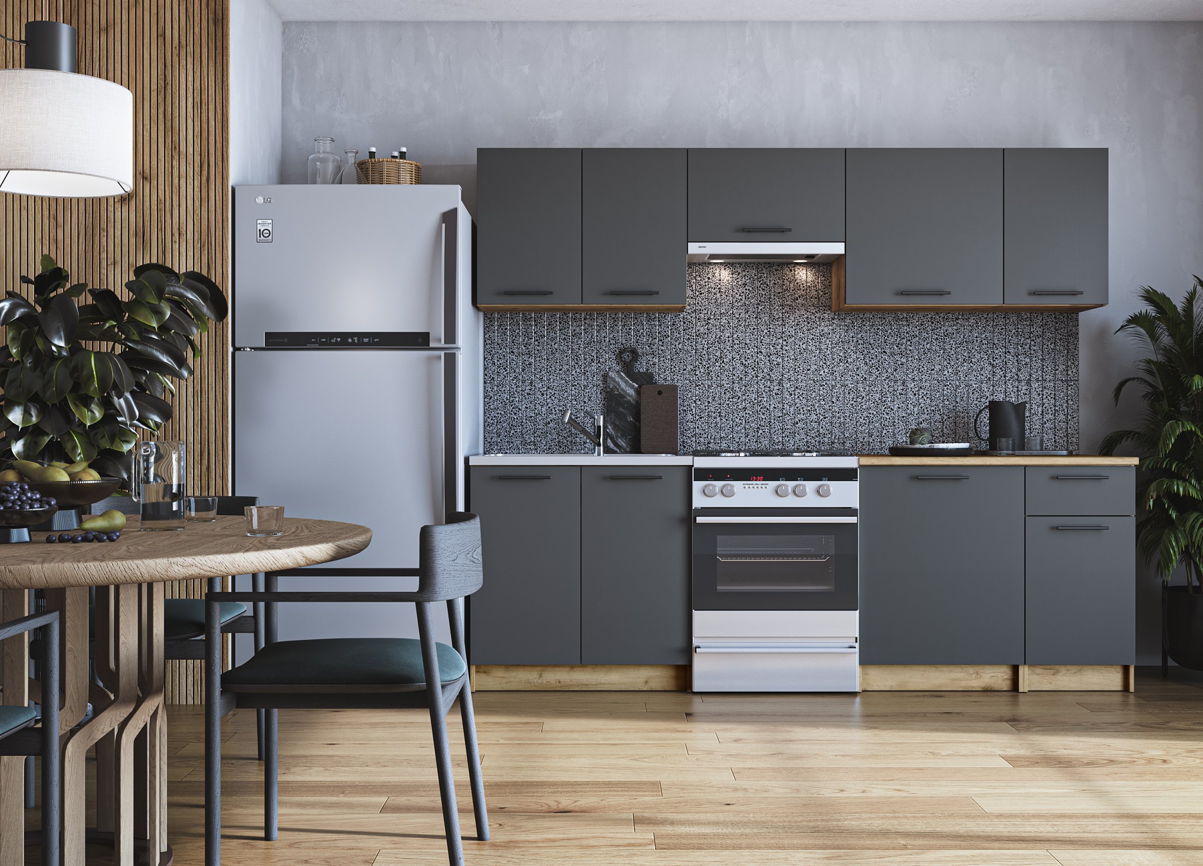 komplekti pikkus: 240cm, gaasitõstukid, töötasapinna paksus: 28 mm, värvid: ees – antratsiit, korpus – käsitöö tamm, töötasapind – antratsiit
