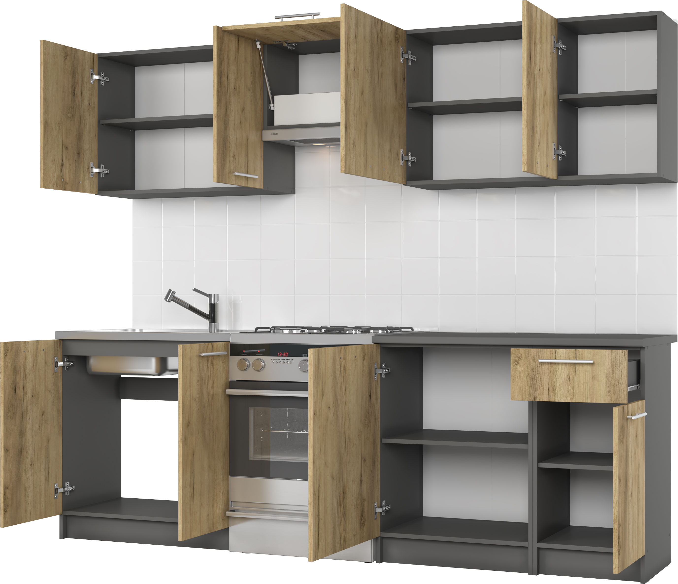 komplekti pikkus: 240cm, gaasitõstukid, töötasapinna paksus: 28 mm, värvid: esiosa – käsitöö tamm, korpus – antratsiit, töötasapind – antratsiit