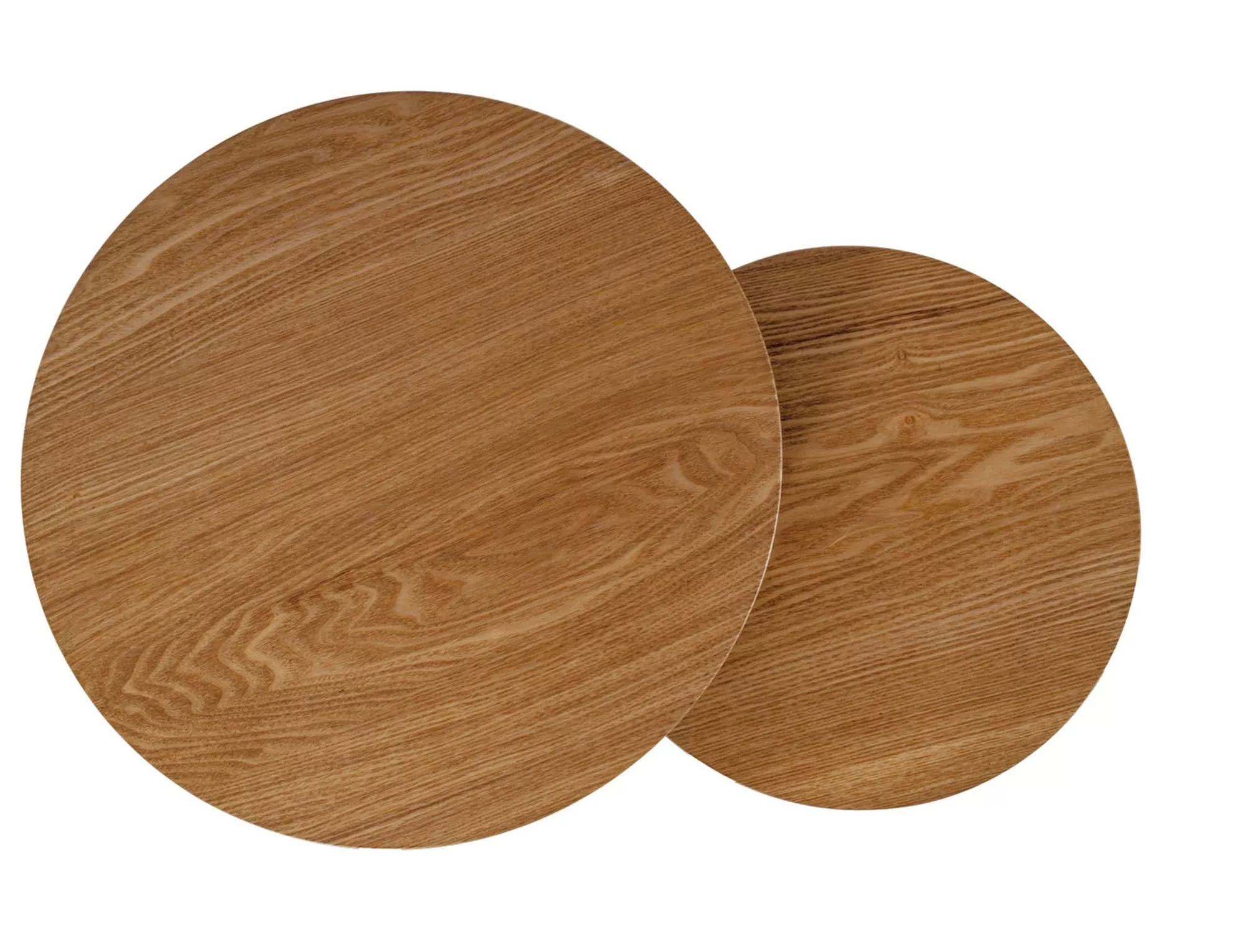 Pingide komplekt, pealispind: MDF + spoon, raam: metall, värvus: tamm / must. Väiksema laua mõõdud: läbimõõt 43; kõrgus: 35 cm.