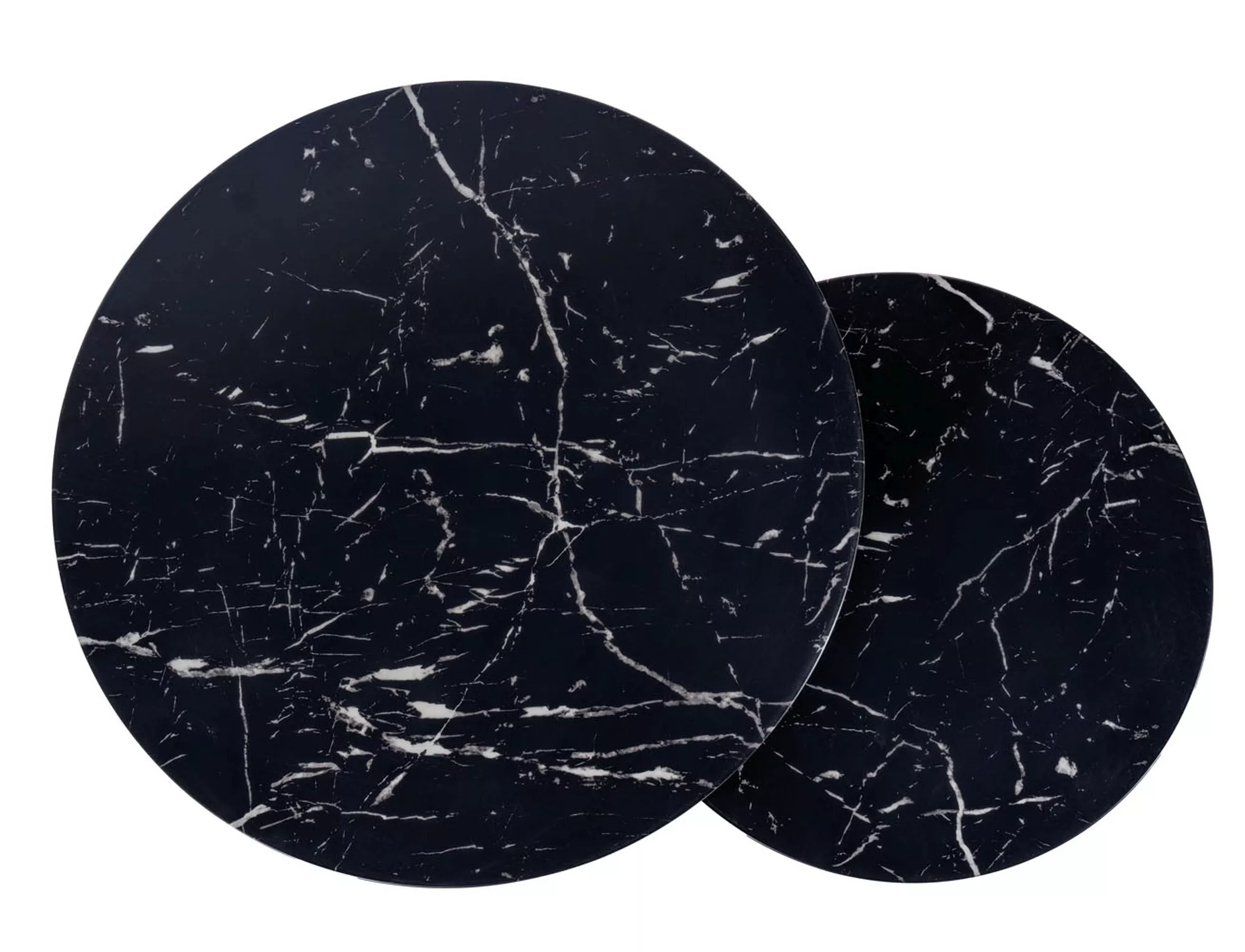 Lauakomplekt, pealispind: MDF + marmorist spoon, raam: metall, värvus: must/must. Väiksema laua mõõdud: läbimõõt 43; kõrgus: 35 cm.