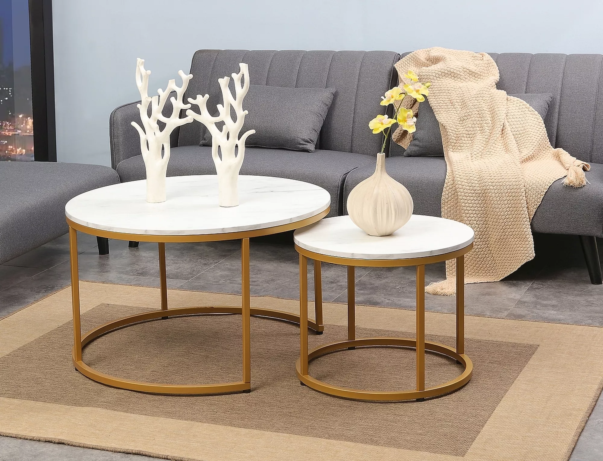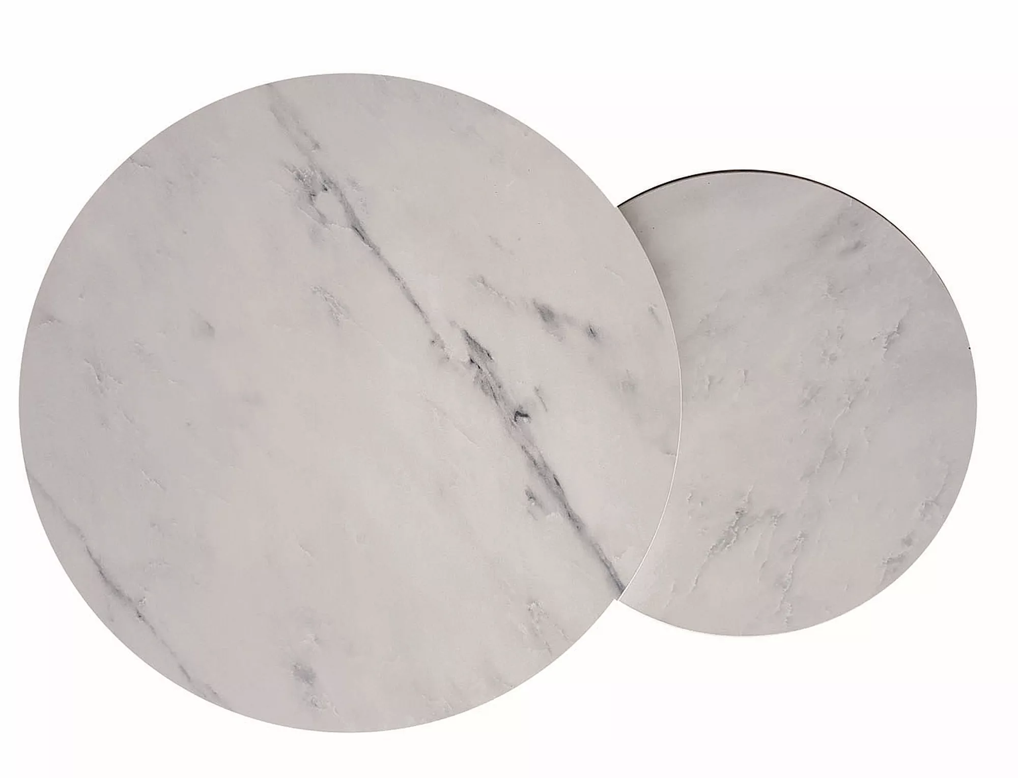 Pingide komplekt, pealispind: lamineeritud plaat, raam: metall, värvus: valge, marmorefekt / kuld. Väiksema laua mõõdud: läbimõõt 48; kõrgus: 42 cm.