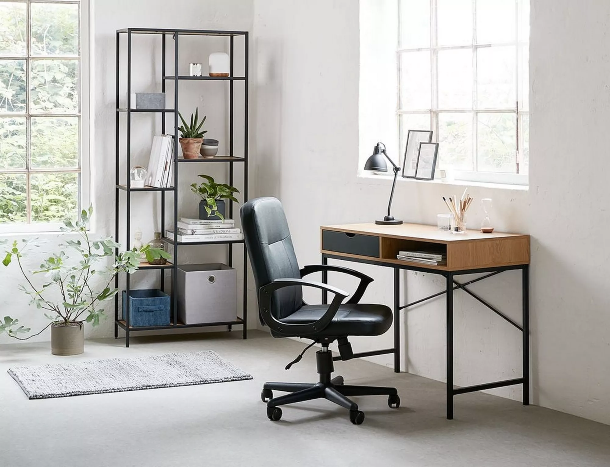 Kirjutuslaud, pealispind: lamineeritud plaat, raam: metall, värvus: tamm / mattmust. Sahtli kõrgus 10cm.