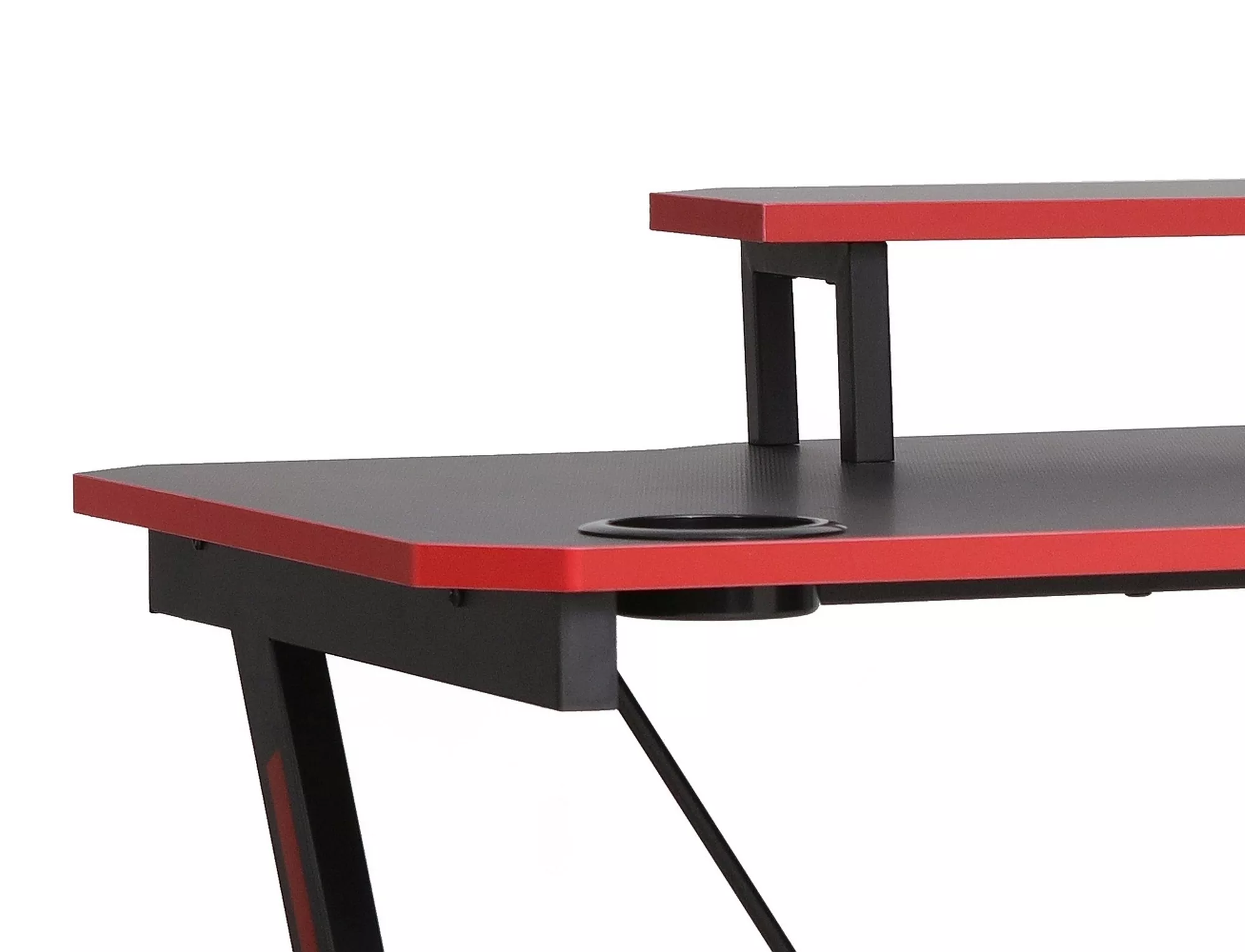 Kirjutuslaud, pealispind: lamineeritud plaat, raam: metall, värvus: must + punane ülemine serv. Tassihoidja, kõrvaklapid. Kõrgus koos pikendusega: 88cm.