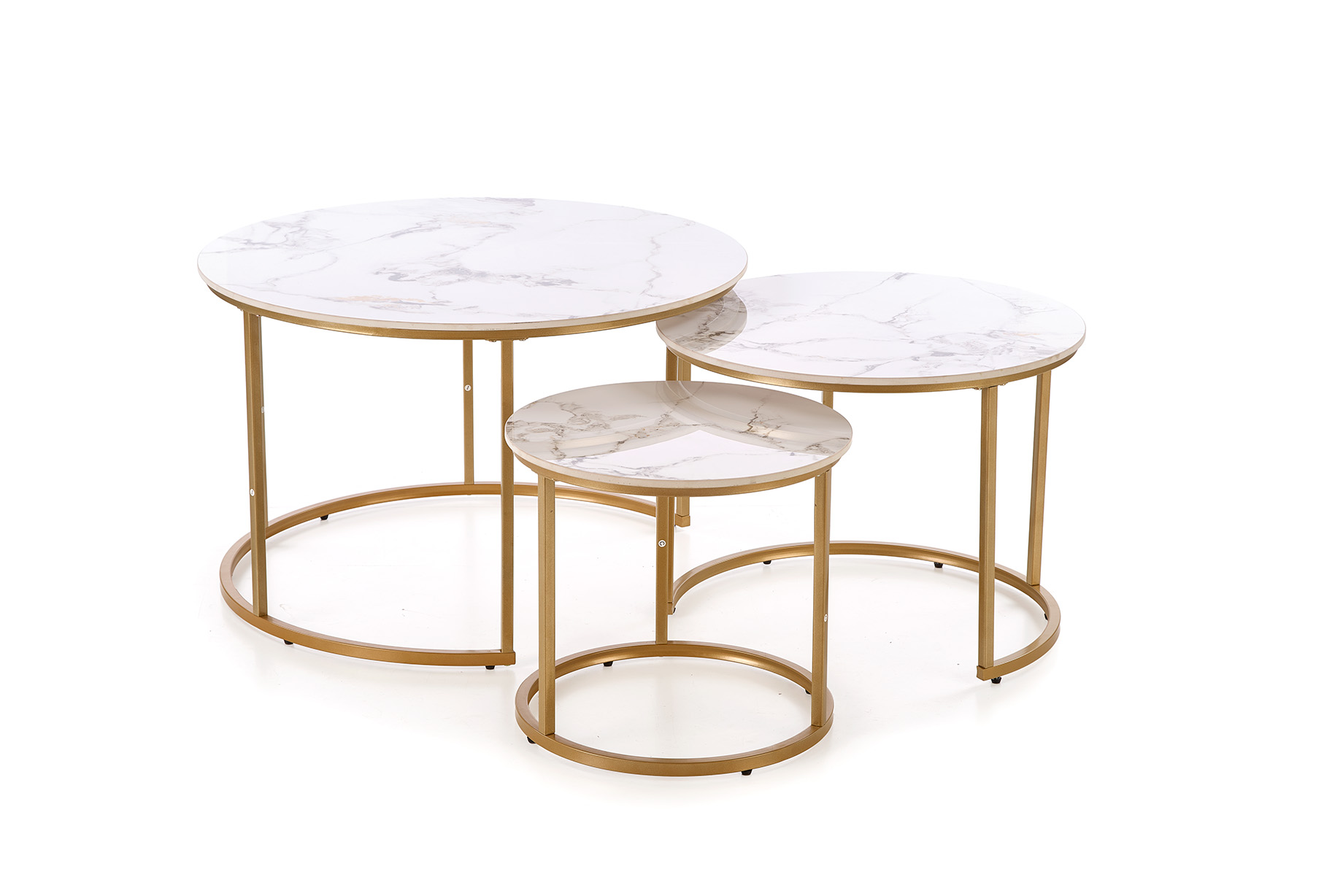 mõõdud: 80/50 cm, 60/45 cm ja 45/40 cm; kolmene komplekt, materjal: paagutatud kivi / pulbervärvitud teras, värvus: valge marmor / kuld