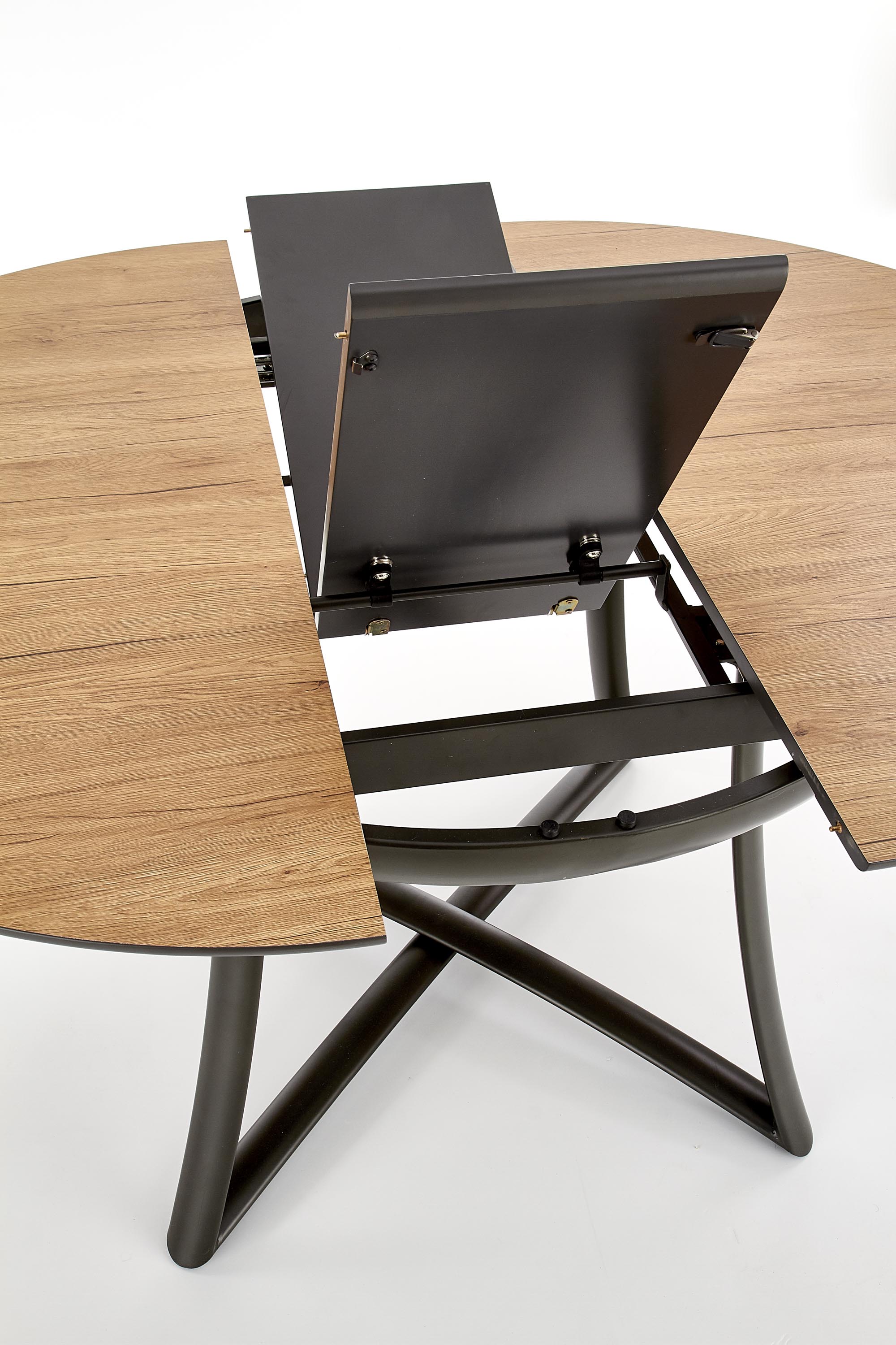 mõõdud: 118÷148/118/76 cm, pikenduslaud, materjal: lamineeritud MDF / lakitud MDF / pulbervärvitud teras, värvus: pealisosa – kuldne tamm / must, jalad – antratsiit