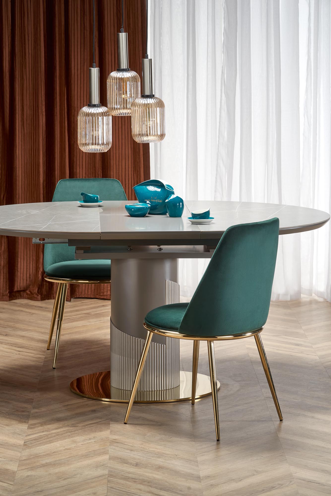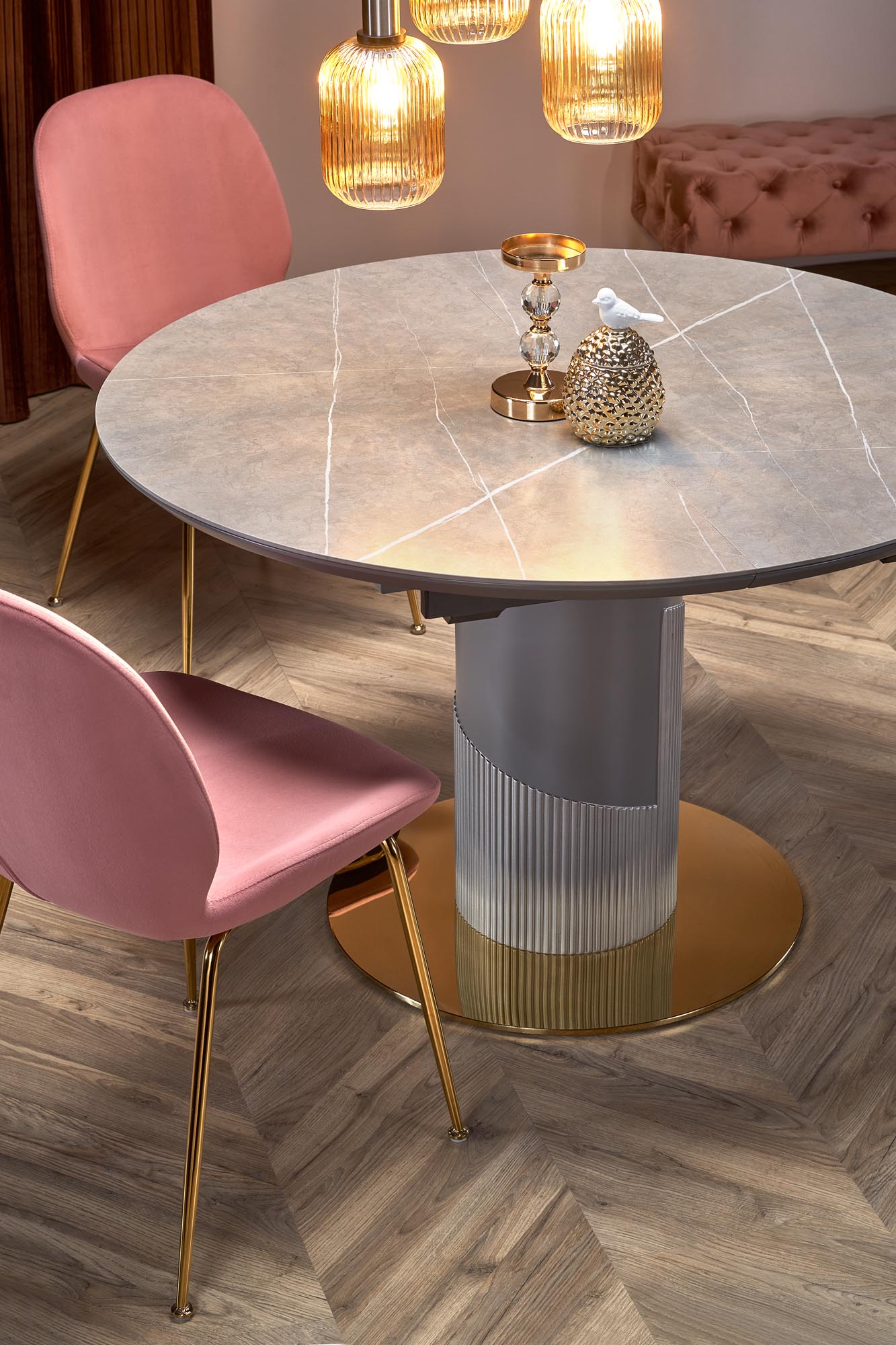 mõõdud: 120-160/120/76 cm, pikenduslaud, materjal: keraamika / lakitud MDF / kroomteras / polüpropüleen, värvus: pealispind – hall marmor, jalad – helehall / kuld