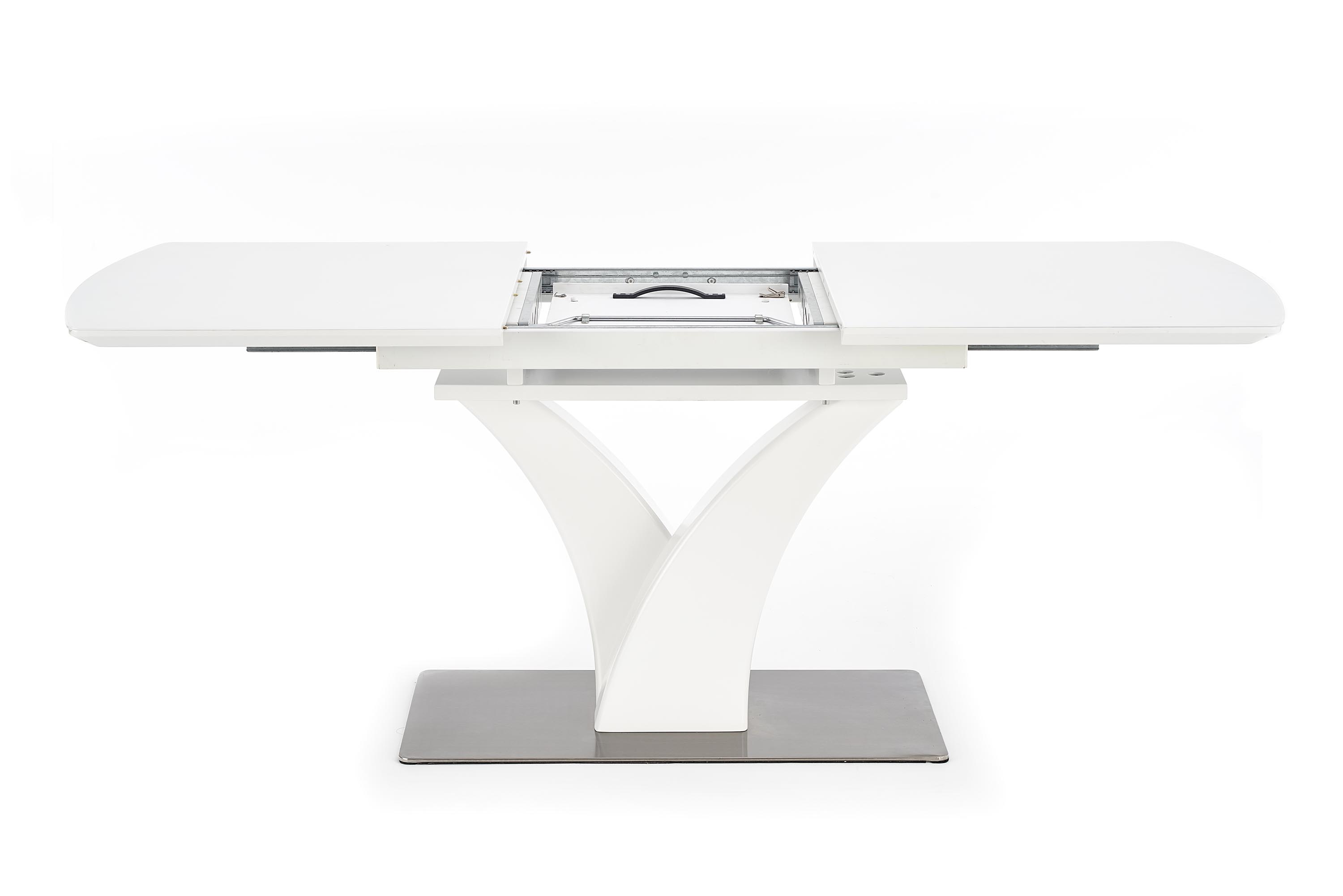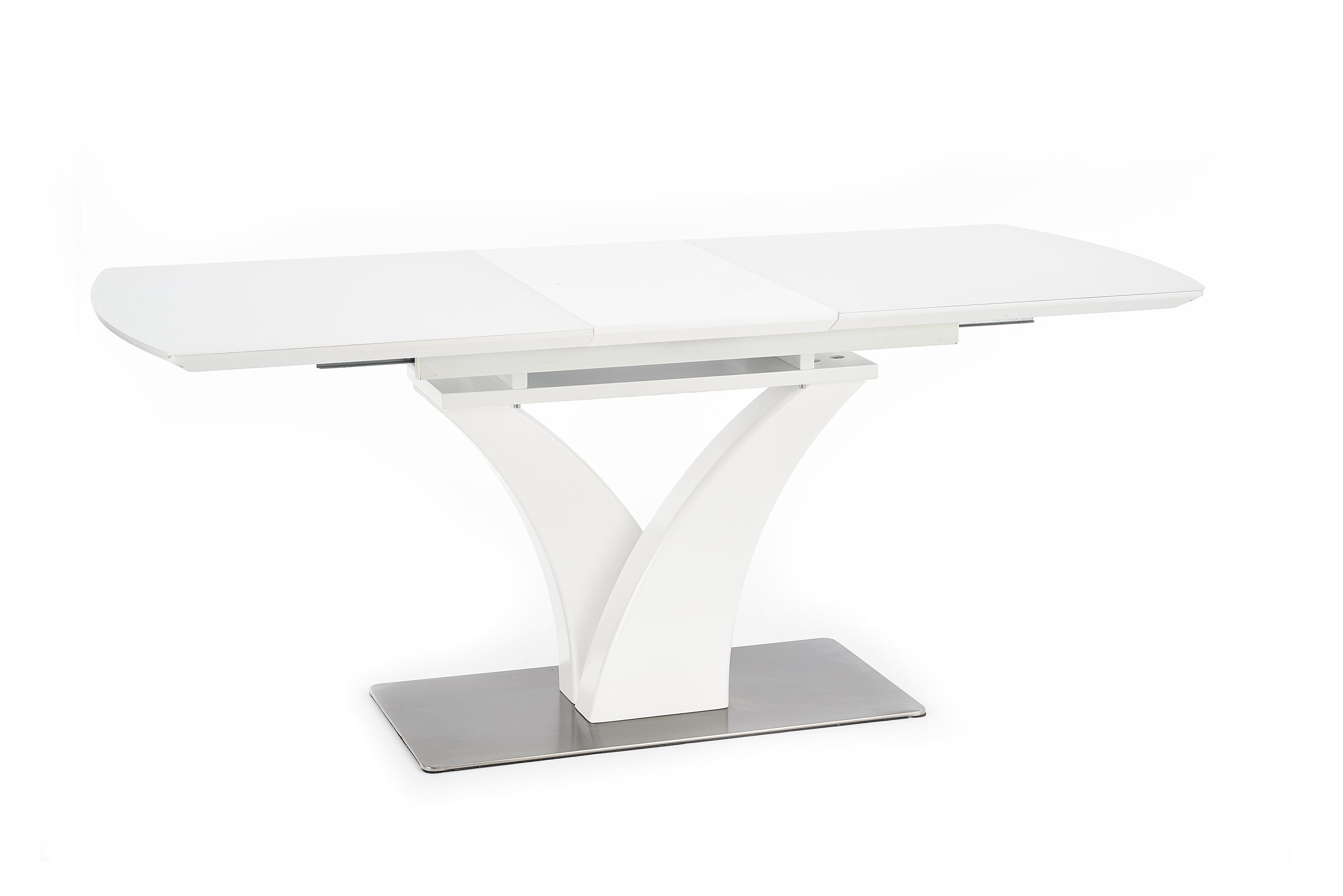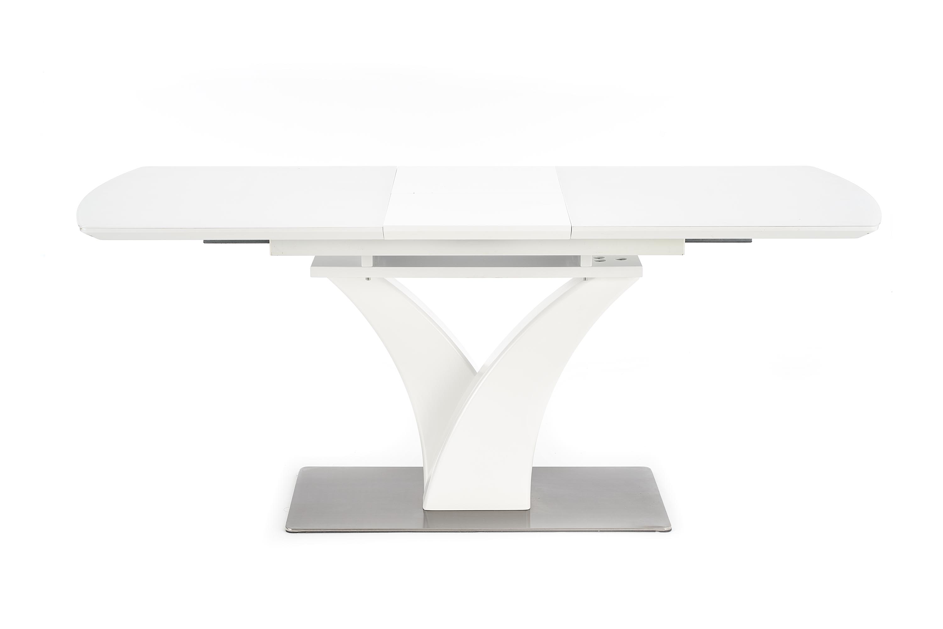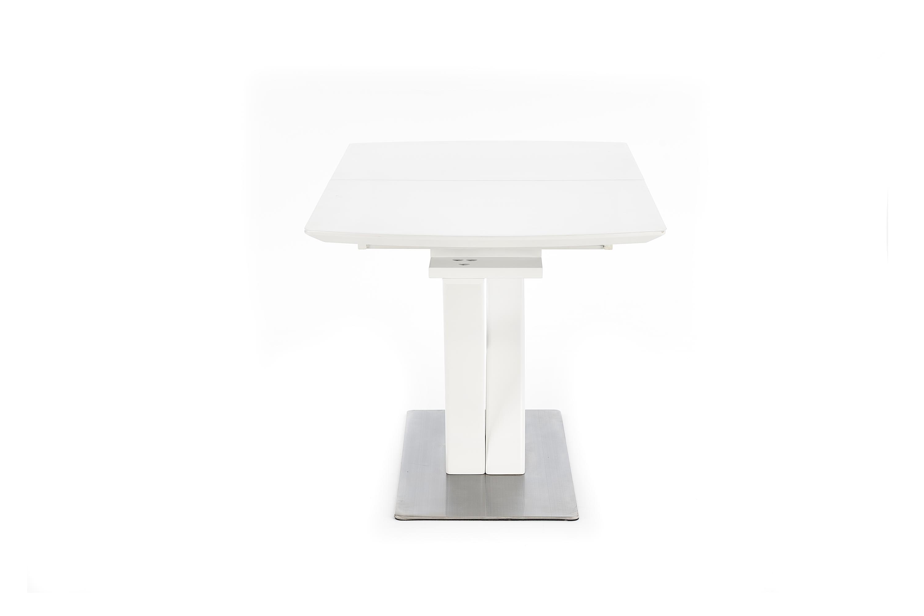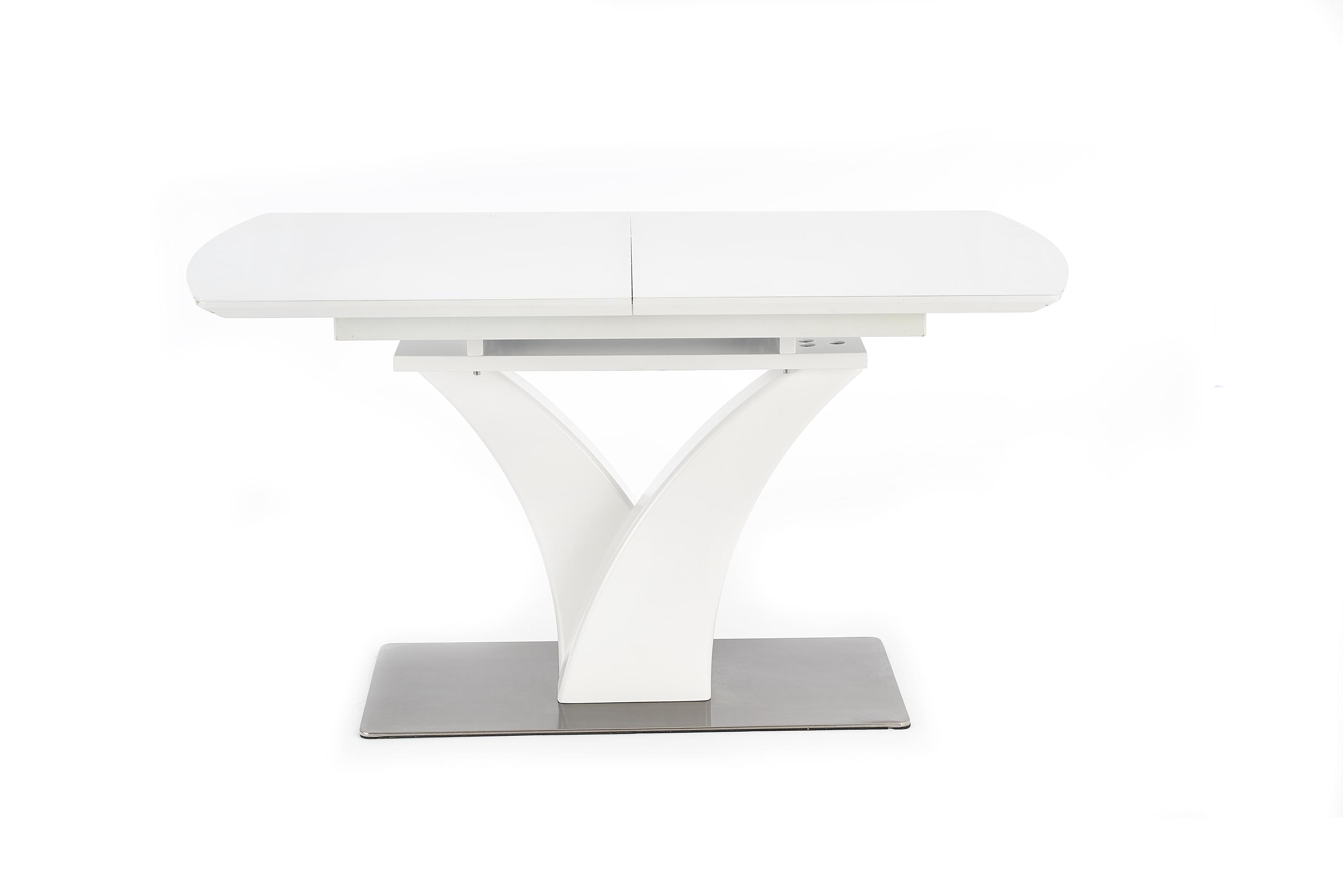 mõõdud: 140÷180/80/75 cm, pikenduslaud, materjal: klaas / lakitud MDF / roostevaba teras, värvus: valge