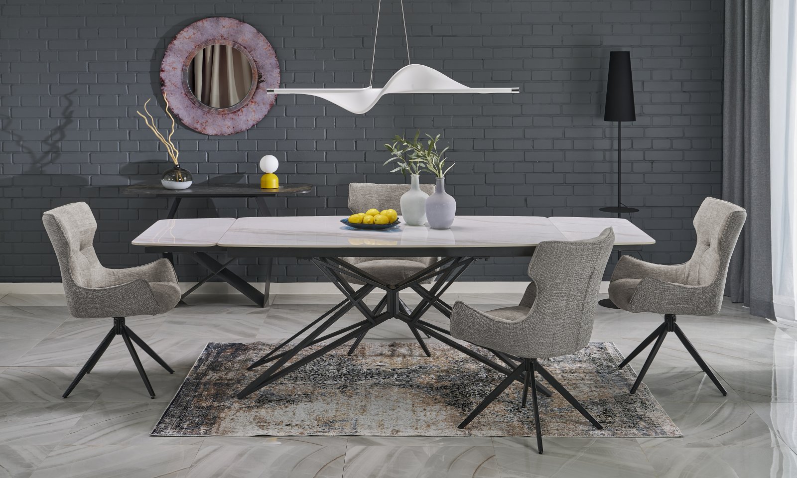 Mõõdud: 160/240/91/76 cm, pikendatav söögilaud, materjal: paagutatud kivi / pulbervärvitud teras, värvus: pealispind – valge marmor, jalad – must.