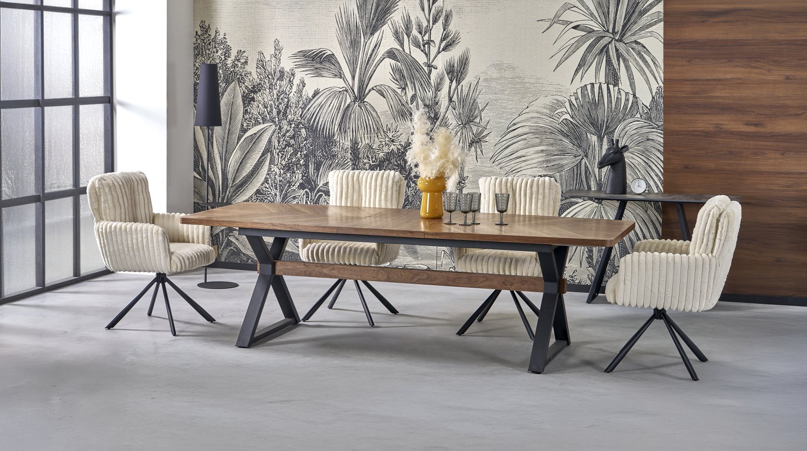 mõõdud: 200-350/100/75 cm, pikenduslaud, materjal: MDF + naturaalne spoon/pulbervärvitud teras, värvus: pealmine pähkel, jalad – must