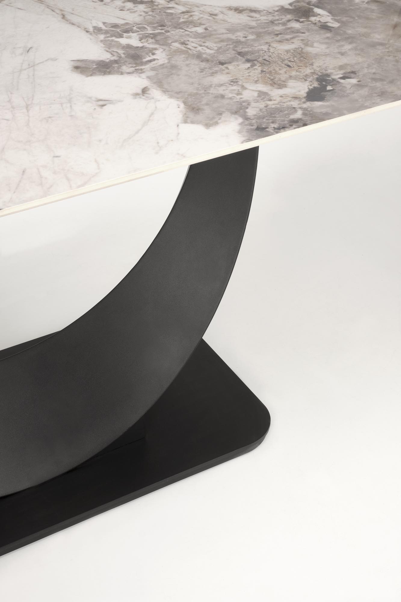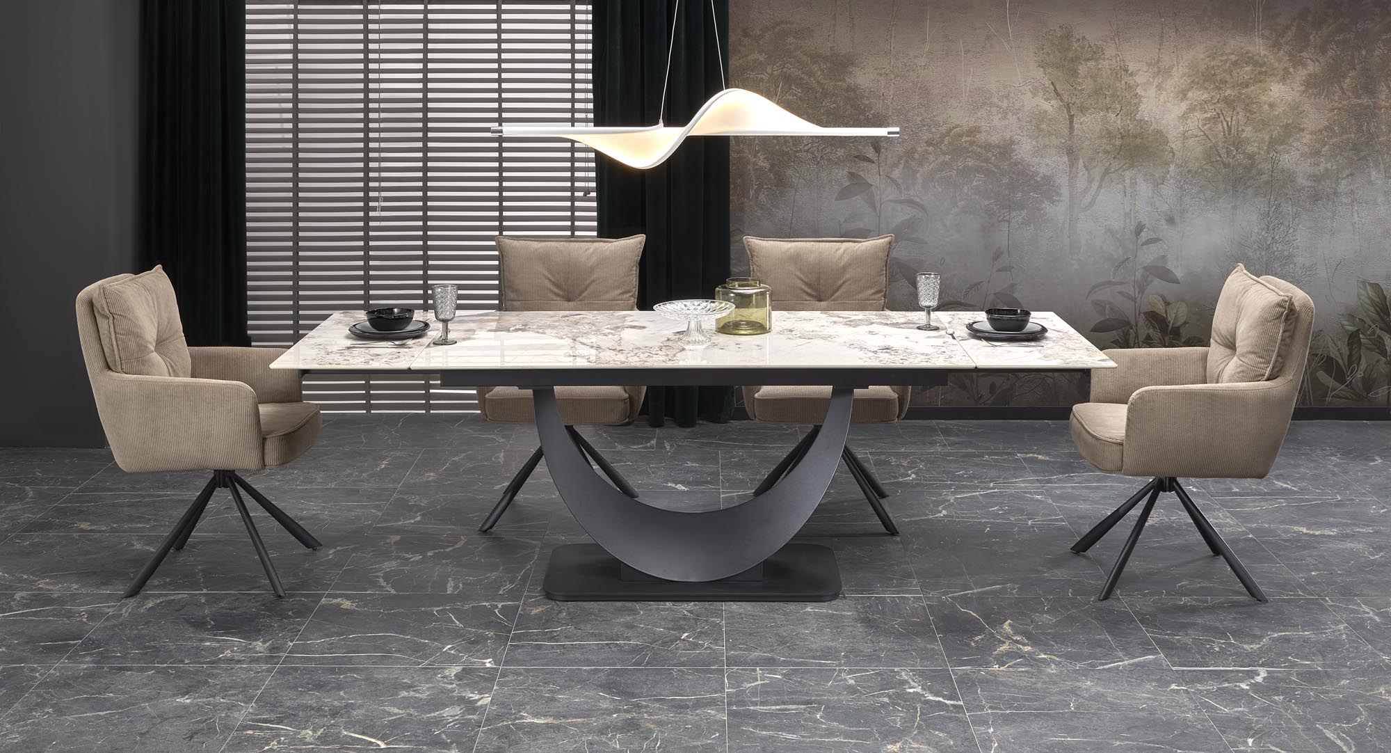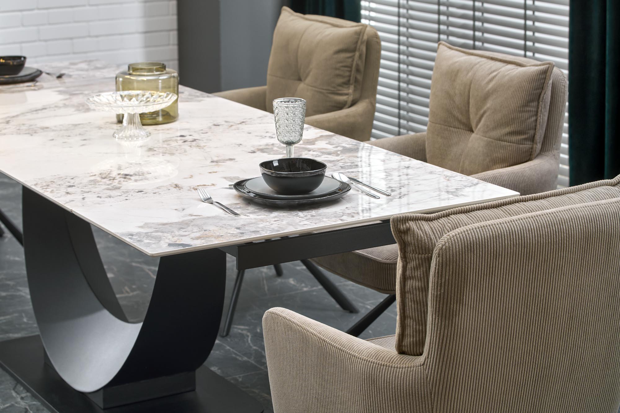 mõõdud: 160-240/92/75 cm; pikenduslaud, materjal: paagutatud kivi / pulbervärvitud teras, värvus: pealispind – valge marmor, jalad – must