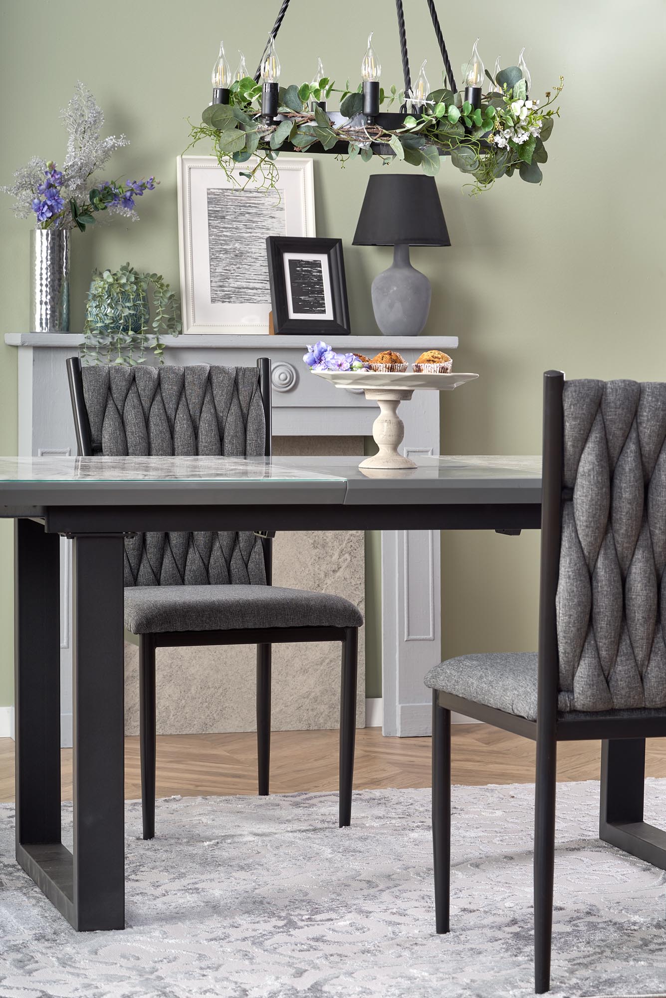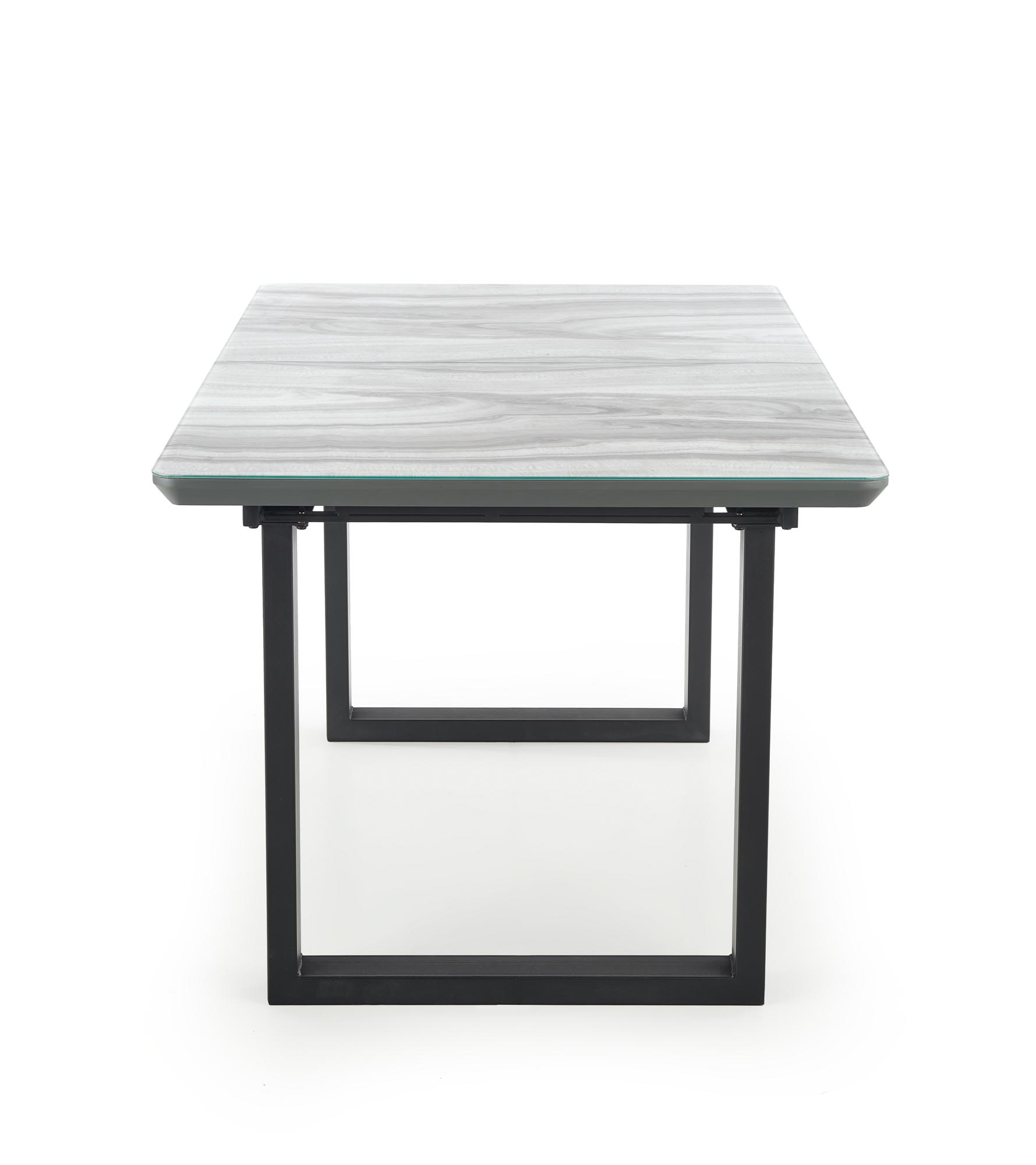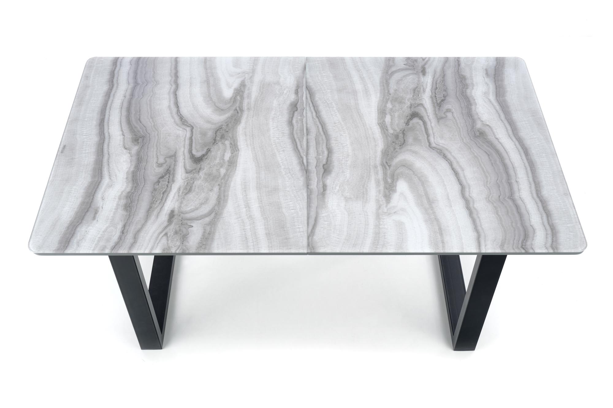 pikenduslaud, mõõdud: 160-200/90/76cm, materjal: klaas / lakitud MDF / pulbervärvitud teras, värvus: pealispind – valge marmor / hall, jalad – must